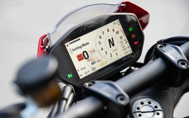 全彩儀表是當下流行的趨勢,這塊4.3英寸的儀表和新的Panigale系列用的差不多,不管是內(nèi)部布局,還是顯示效果都對得起杜卡迪的檔次。