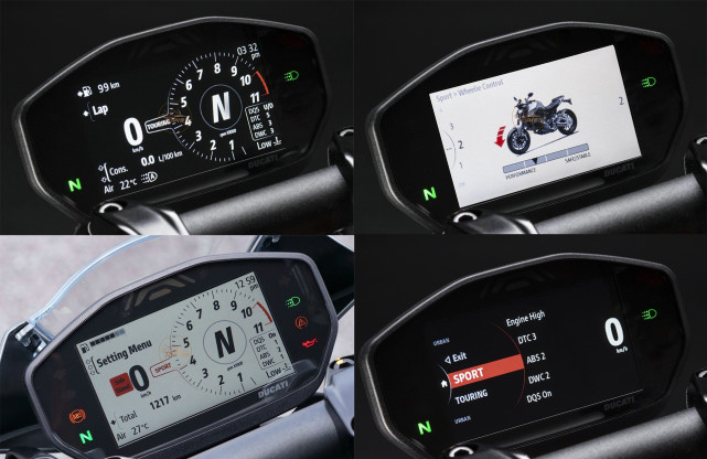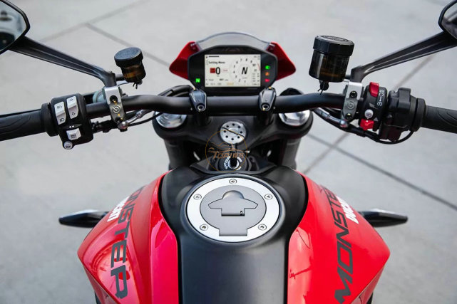 這臺儀表功能豐富,具備自動切換背景顏色功能,提供共有三種騎行模式。Monster 950還配備 IMU、ABS、牽引力控制(八級)、彎道ABS(三級)、車輪控制(四級),起步控制、快速換擋,以及智能動力模式。
