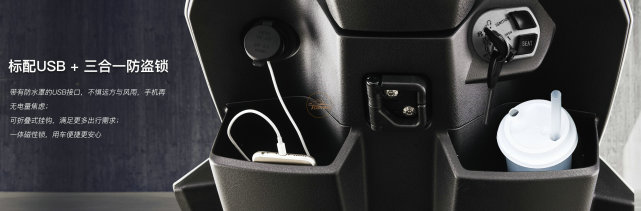 儲(chǔ)物空間方面,車把下的兩個(gè)儲(chǔ)物格都很大,放兩瓶水肯定是沒有問題的,另外還有個(gè)折疊式的掛鉤,以及USB的充電口,尾箱的開啟按鍵就設(shè)置在鑰匙孔旁邊,非常方便。