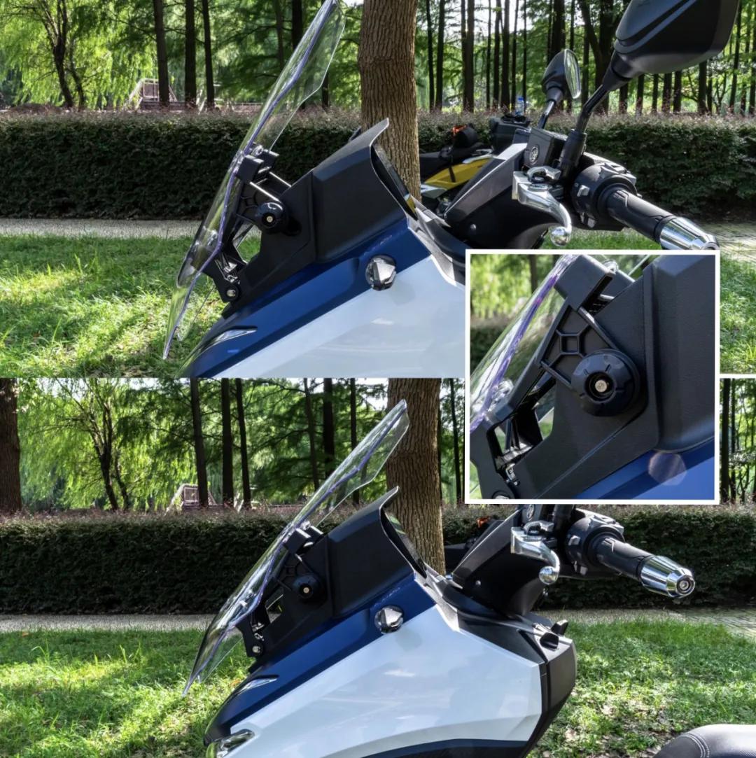 大陽ADV350這輛車頭部的“信息量”可謂是非常之大,我們一一看來,首先便是在國產(chǎn)同級別踏板中獨(dú)一無二的可調(diào)風(fēng)擋,支持手動兩檔調(diào)節(jié),不過并不是大家印象中傳統(tǒng)的高低上下調(diào)節(jié),而是通過同時拉動風(fēng)擋兩側(cè)的旋鈕使風(fēng)擋實(shí)現(xiàn)俯仰角度調(diào)節(jié),從而風(fēng)擋的高度也會變化,這樣的結(jié)構(gòu)使其不支持騎行中調(diào)節(jié),這也是出于騎行安全性的考量。