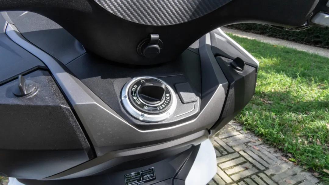 本次大陽ADV350同樣配備了無鑰匙啟動系統(tǒng),電門,油箱蓋,座桶均可由無鑰匙旋鈕控制打開,同時遙控感應(yīng)鑰匙上也設(shè)置有解鎖、開座桶、尋車的按鈕,一開始小編以為這臺車只能通過遙控鑰匙打開座桶,因此還鬧了個烏龍,其實(shí)只需要讓旋鈕處于初始位置,長按五秒就能打開座墊。