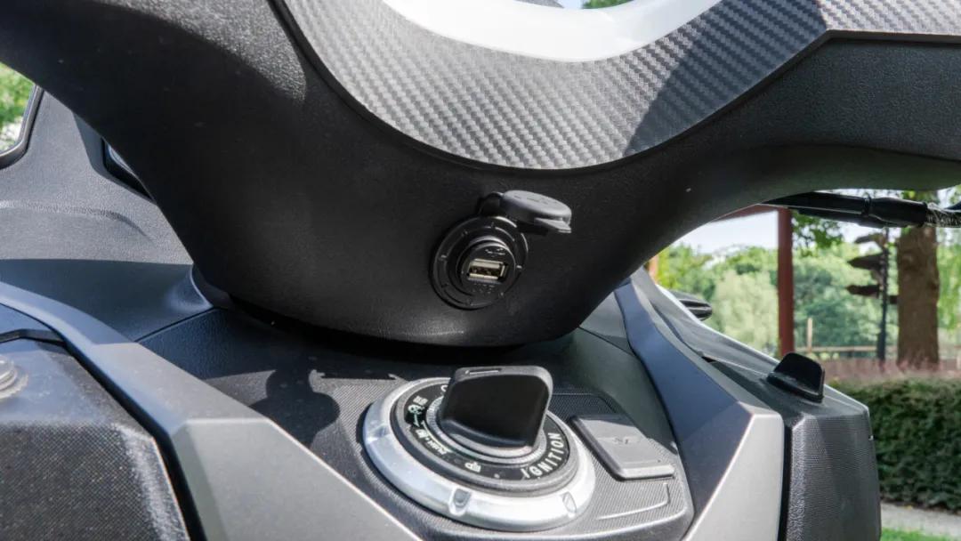 車把中間設(shè)置有USB接口并配備防水蓋,方便給手機(jī)等用電設(shè)備充電。