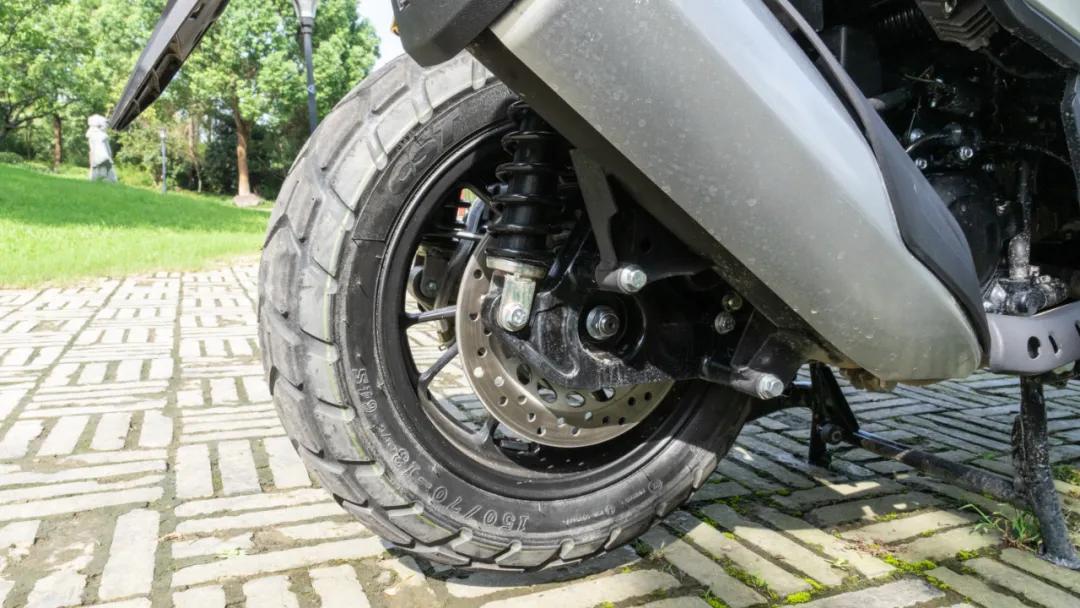行走系統(tǒng)部分,前后均搭載了正新品牌的全地形輪胎,前120-70/14;后150-70/14的尺寸,搭配渝安品牌前正置長行程減震,后雙獨(dú)立氣囊長行程減震,讓整車的通過性更強(qiáng),整車最小離地間隙為165mm。