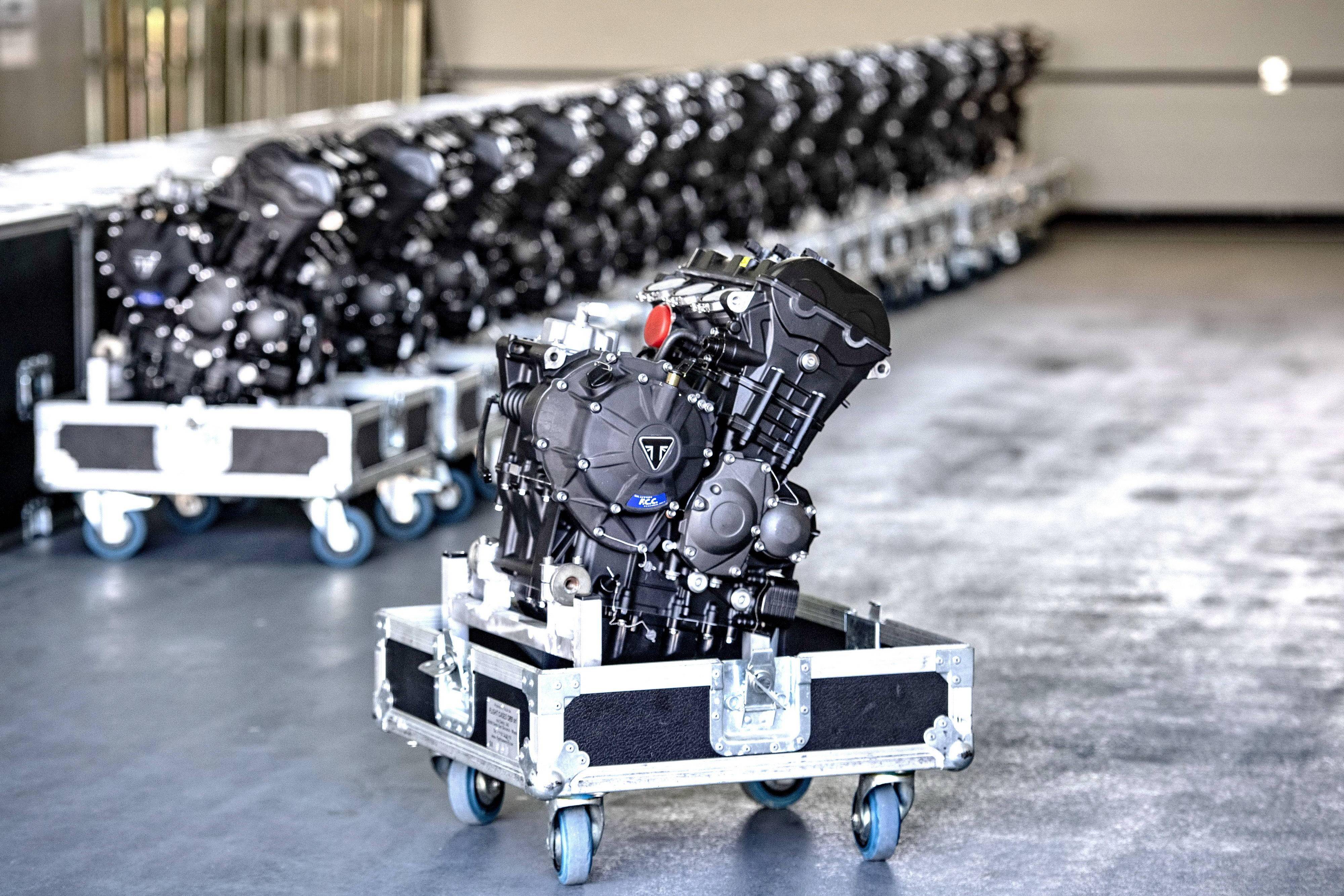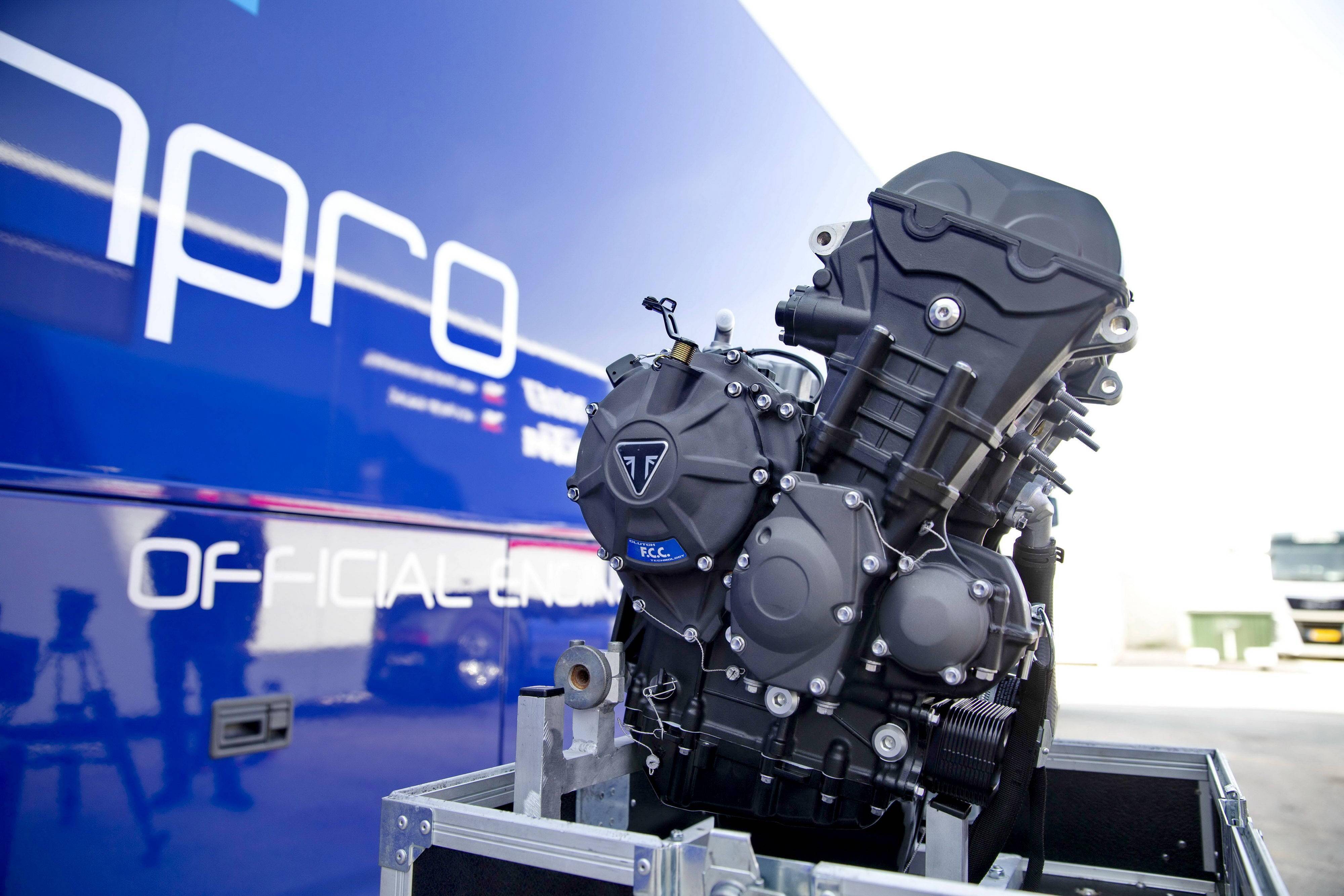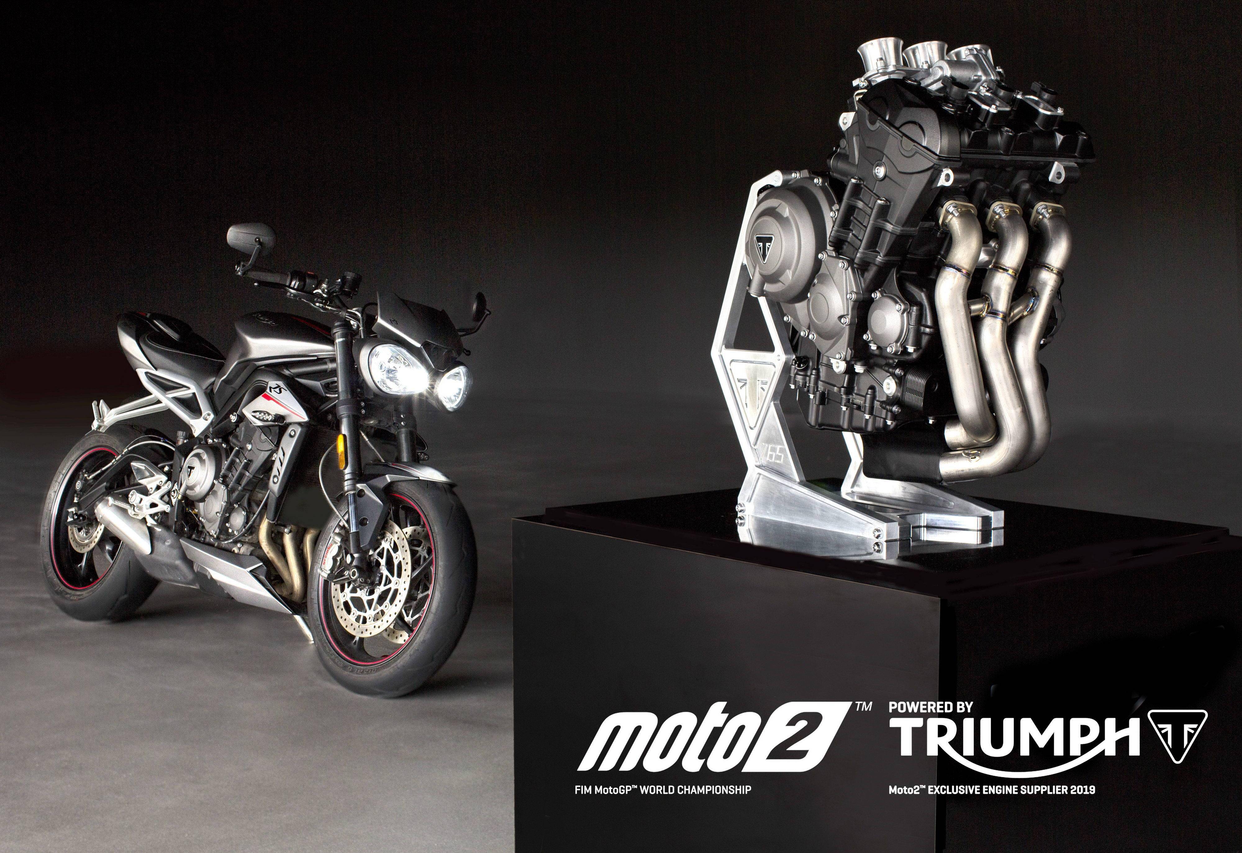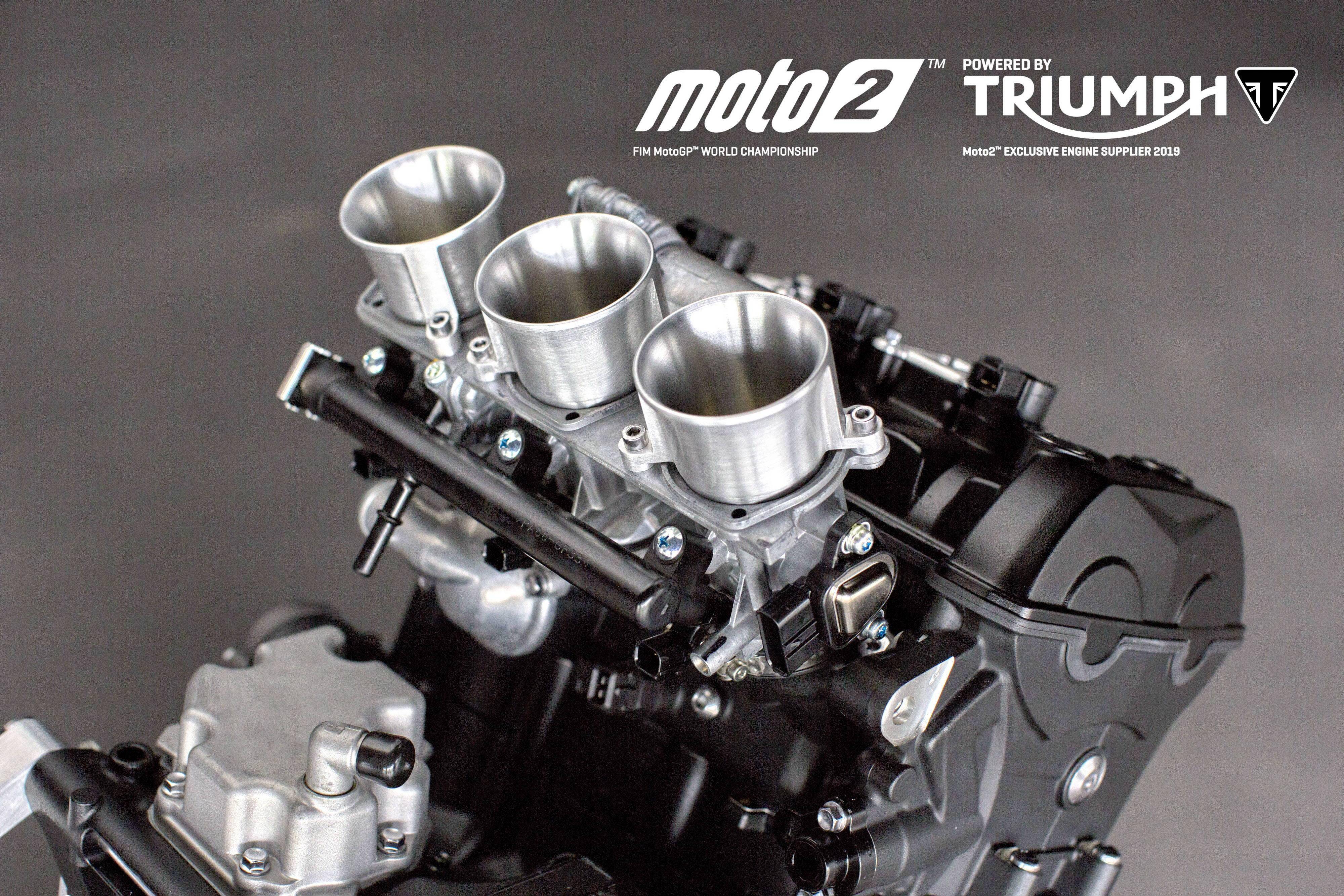 為 Moto2 賽車提供的這副直列三氣缸發(fā)動機(jī)、排氣量 765 cc,原型是來者凱旋摩托的量產(chǎn)車型 Street Triple RS,但經(jīng)過了大量的改裝,有著更高的轉(zhuǎn)速和超過 140 匹馬力(比量產(chǎn)版的發(fā)動機(jī)提高了超過 17%)的峰值輸出。