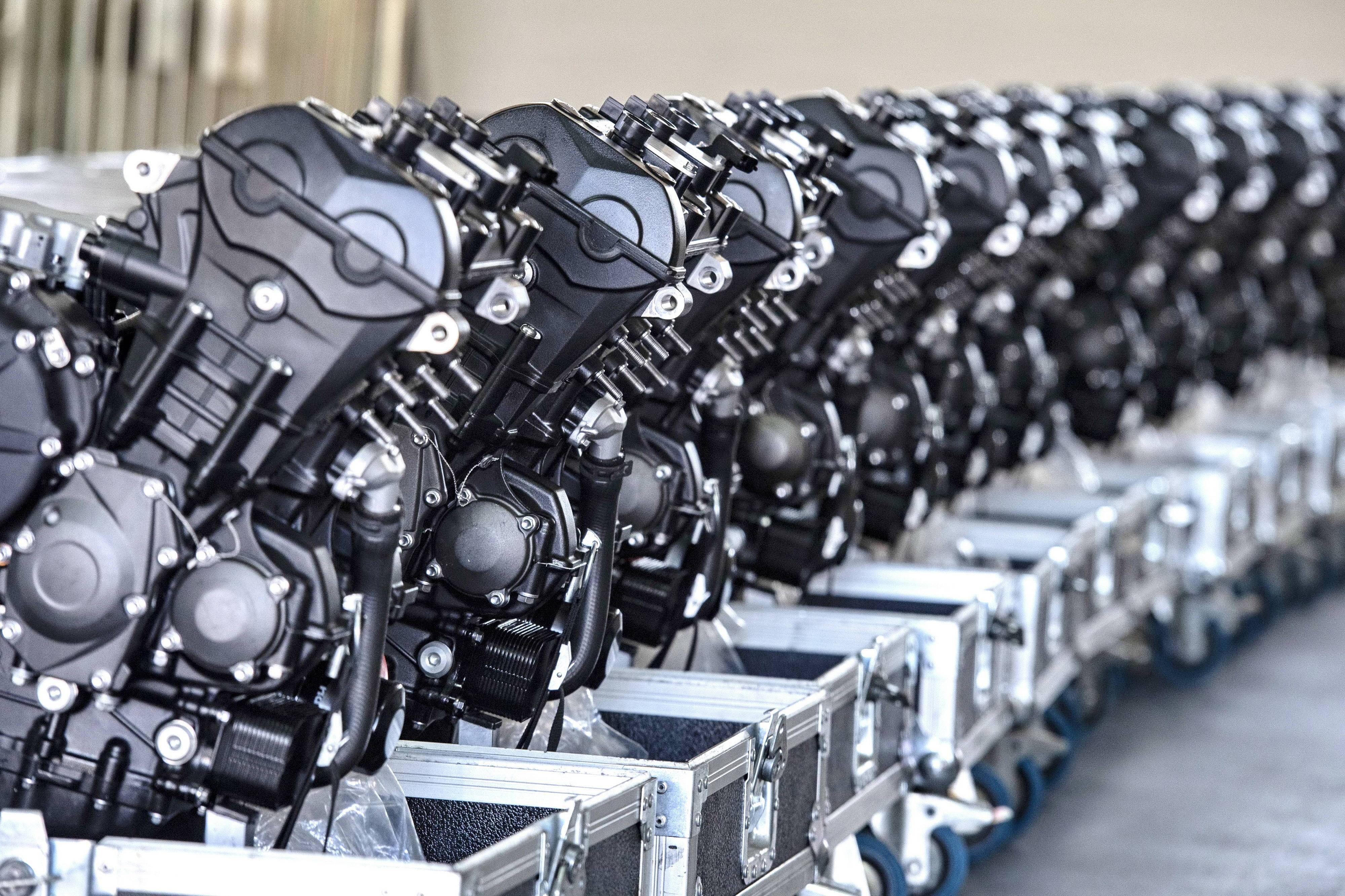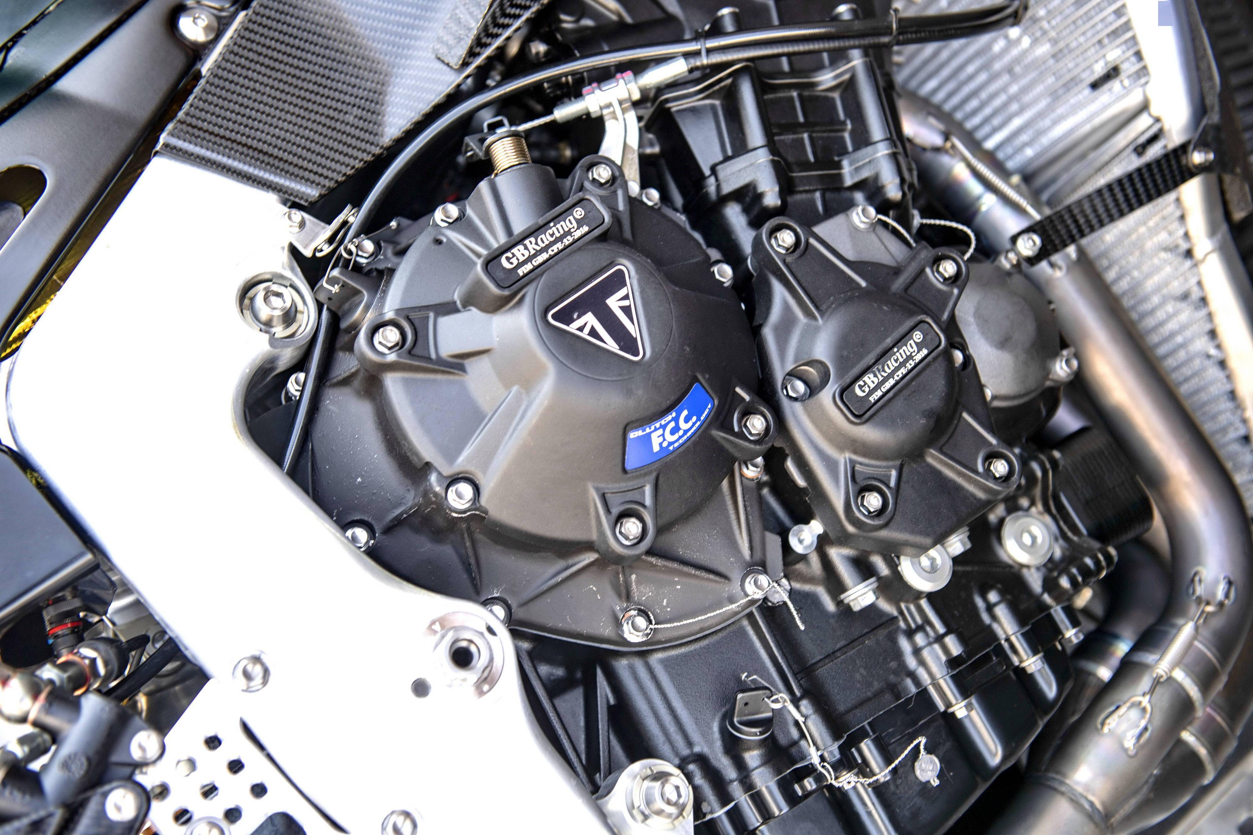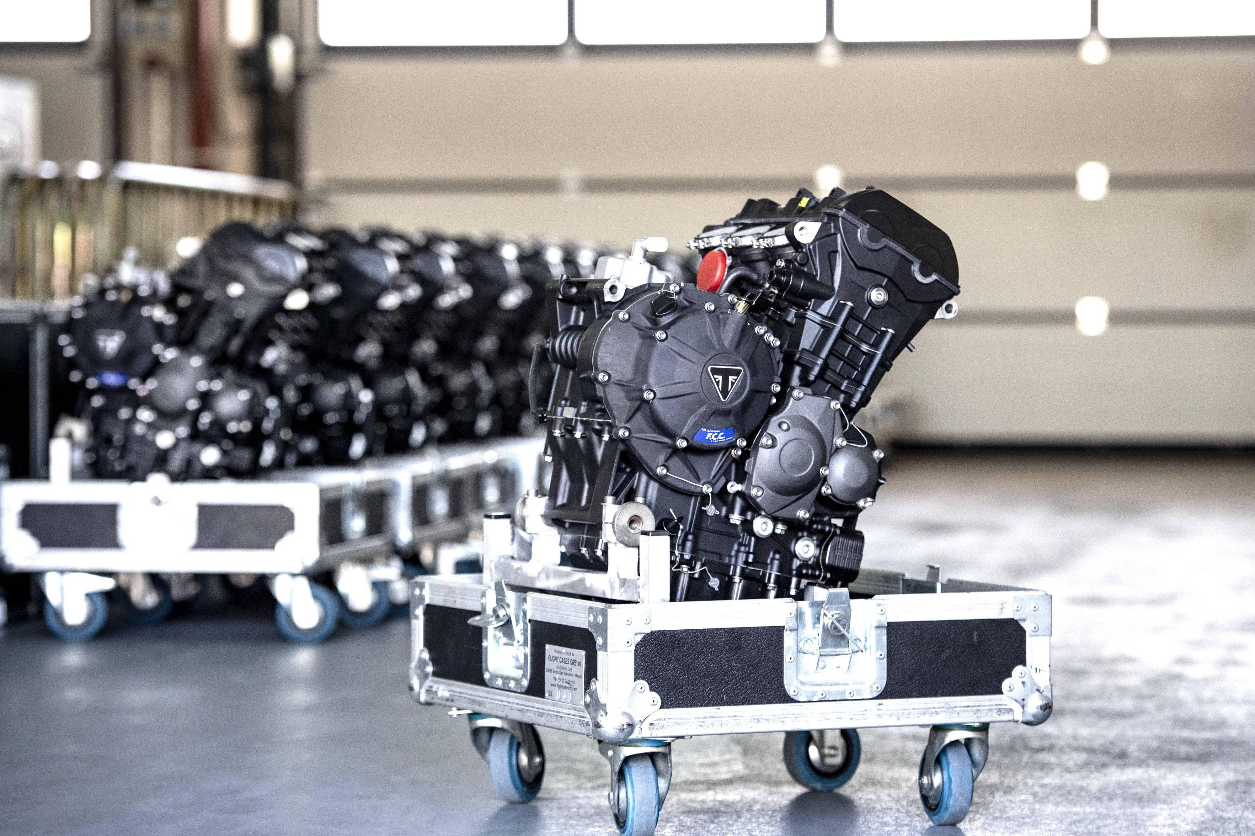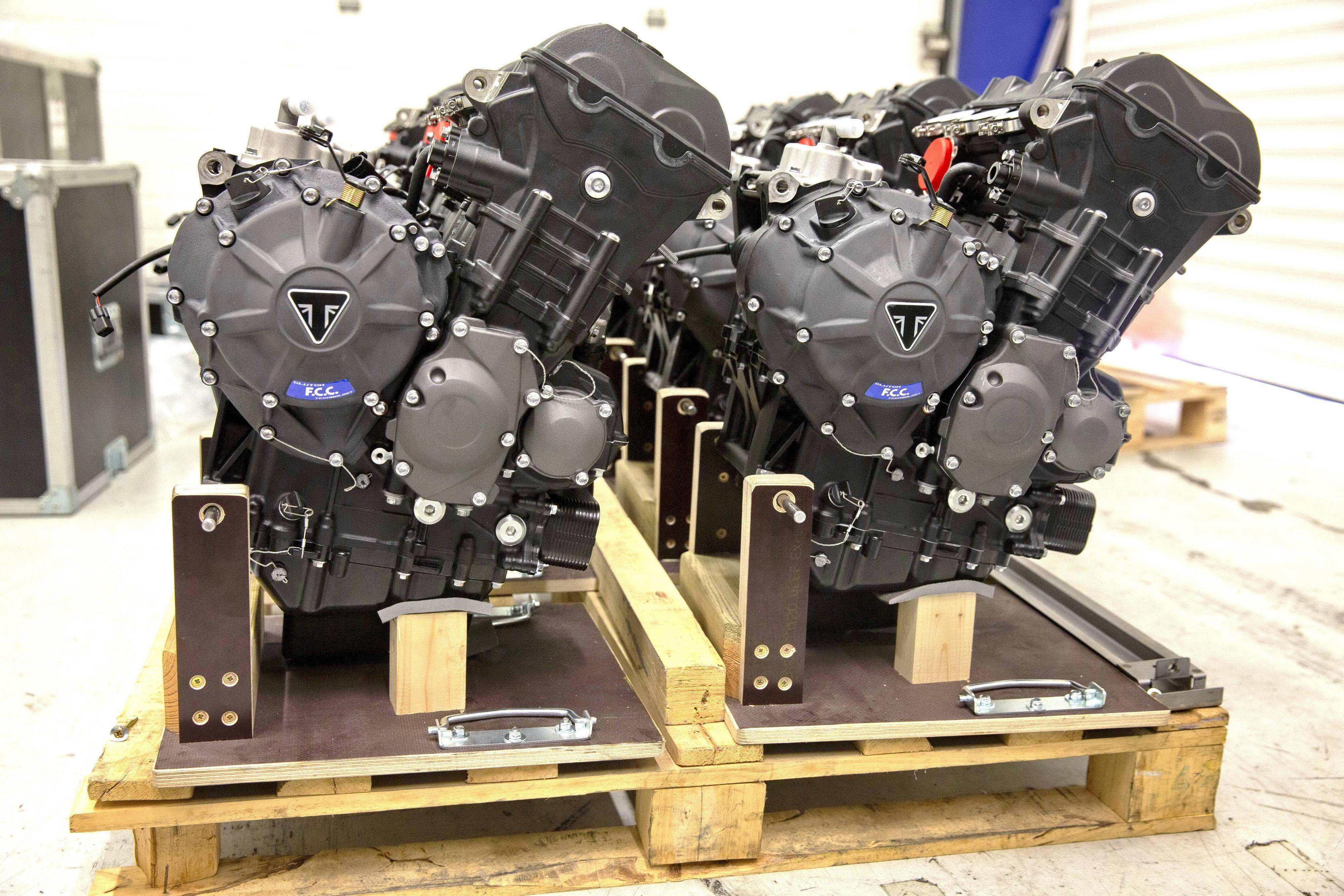 為 Moto2 賽車提供的這副直列三氣缸發(fā)動機(jī)、排氣量 765 cc,原型是來者凱旋摩托的量產(chǎn)車型 Street Triple RS,但經(jīng)過了大量的改裝,有著更高的轉(zhuǎn)速和超過 140 匹馬力(比量產(chǎn)版的發(fā)動機(jī)提高了超過 17%)的峰值輸出。