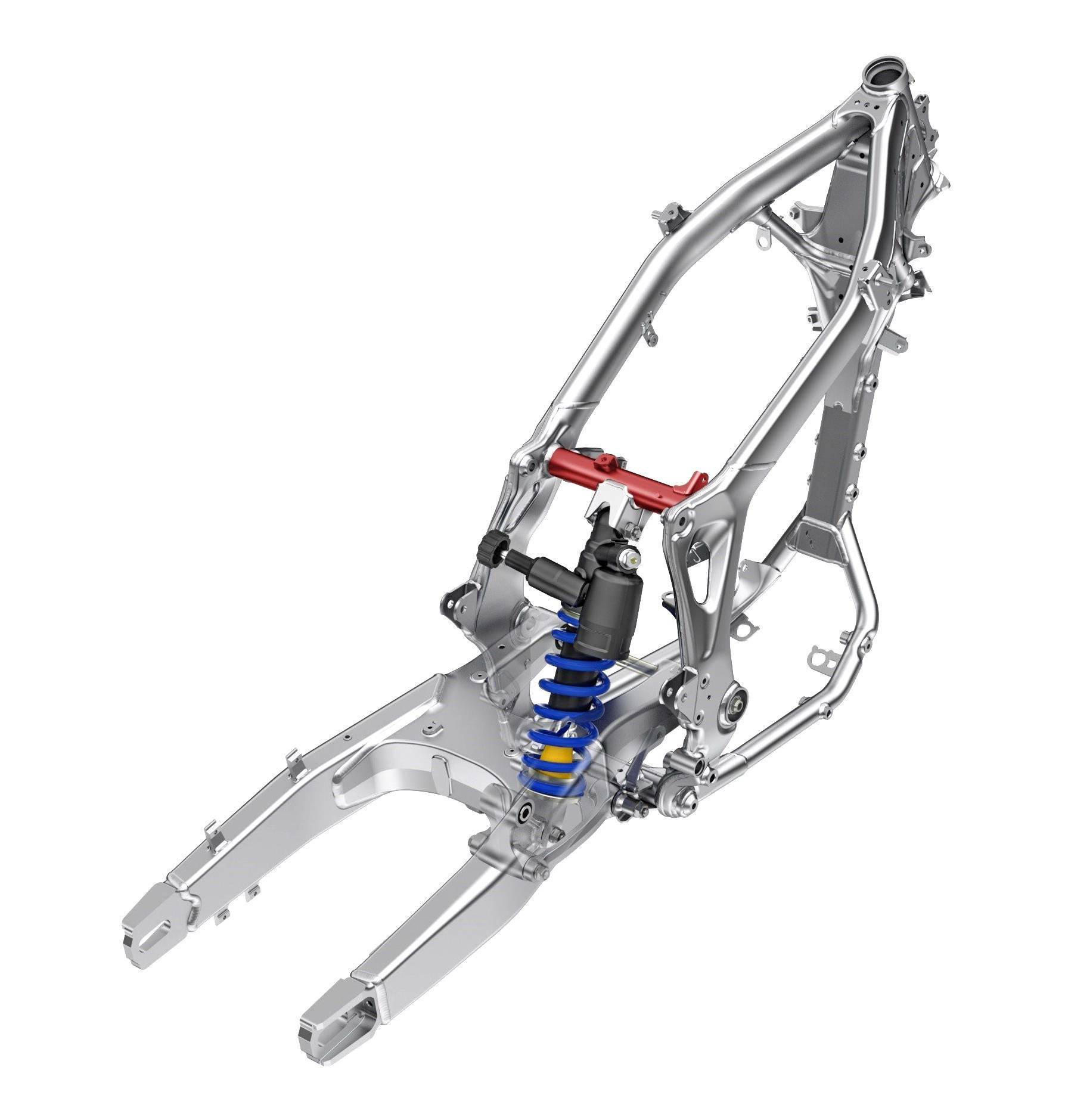 車體方面,2022 款的車架沿用了現(xiàn)行的雙樑型式,在理念上仍是采用了與越野賽車 CRF450R 的結(jié)構(gòu),整副發(fā)動(dòng)機(jī)被四條樑(上下各兩條)所包裹,以提供良好的路面反饋和駕駛操控。懸掛系統(tǒng)是來自 Showa 的配套。