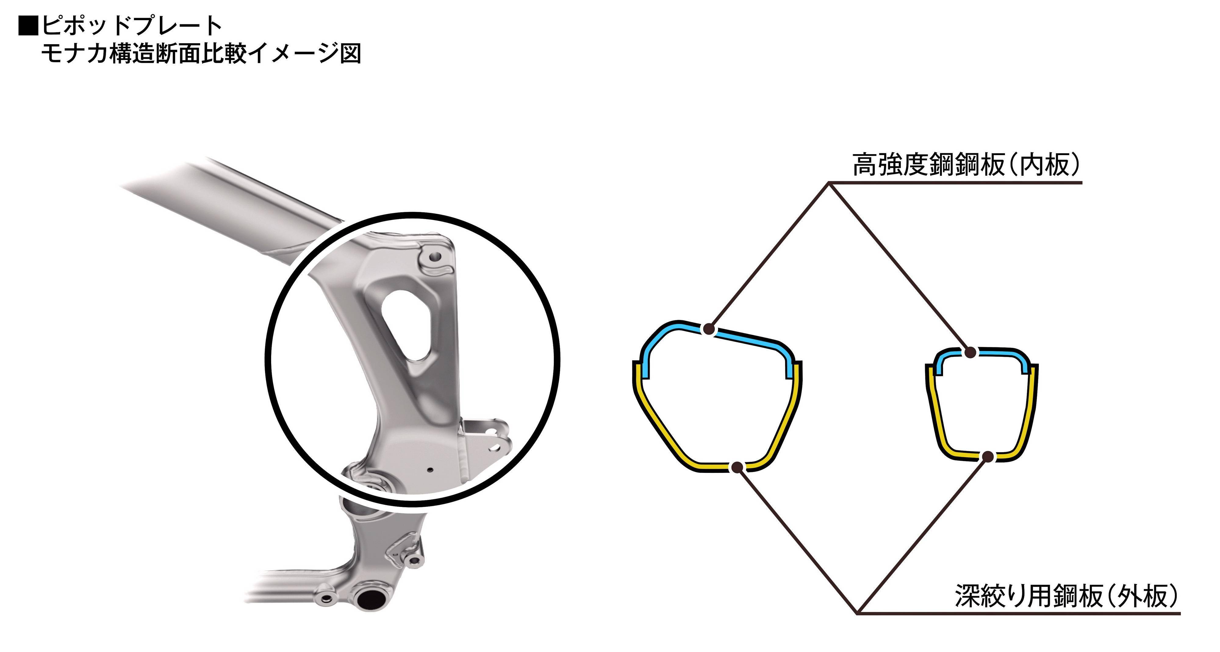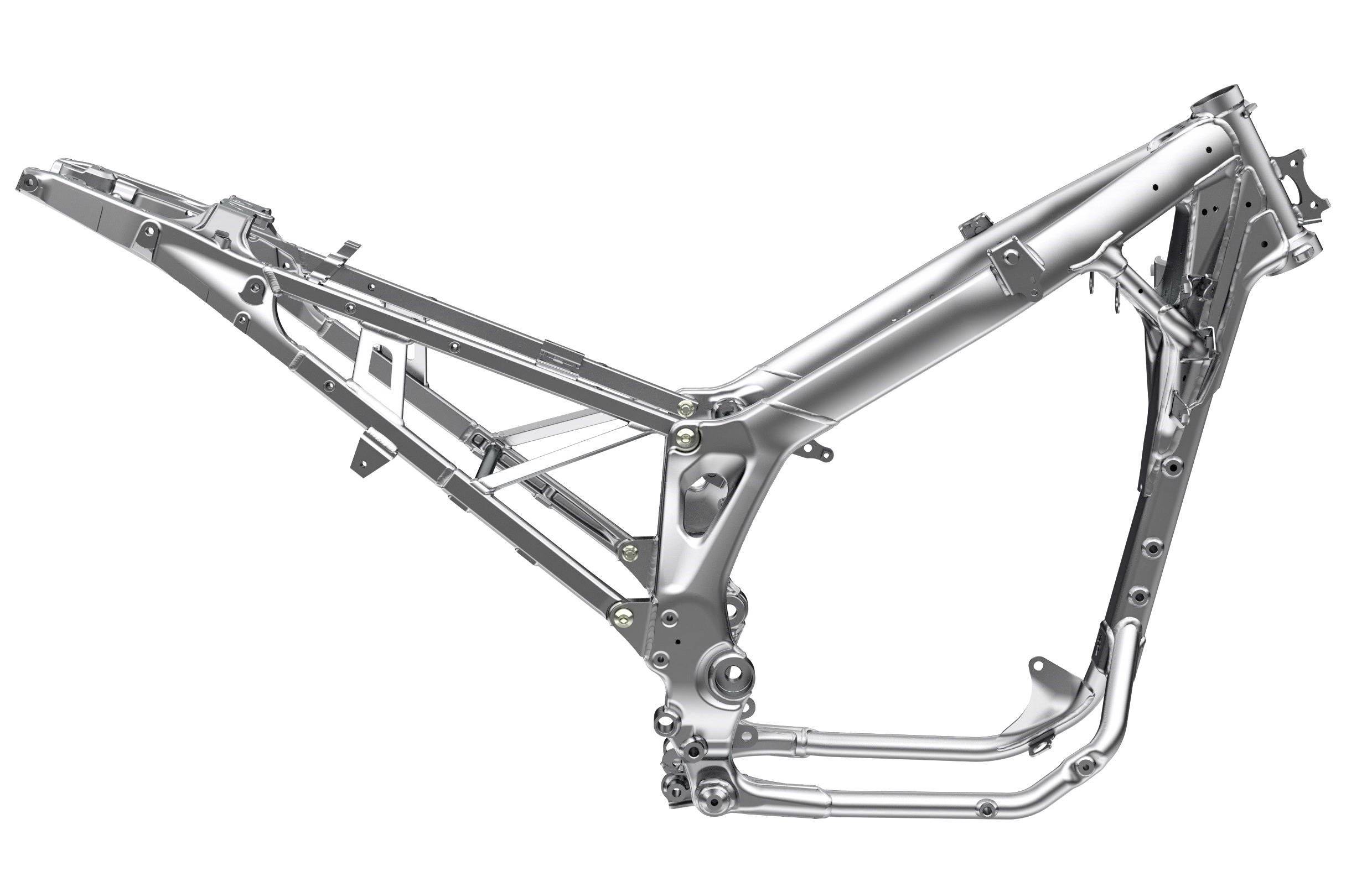 在特點(diǎn)上,車架轉(zhuǎn)向頭周圍的部分(前轉(zhuǎn)向主軸的固定位置)、其剛性在上一版本的基礎(chǔ)經(jīng)過了進(jìn)一步的優(yōu)化,以增強(qiáng)前端抓地力;主樑變得更細(xì)、更直,并去掉了前面的橫管,栓接式的鋁制尾樑、取代了上一版本所采用的整體鋼結(jié)構(gòu)。而鋁合金制的后搖臂,采用了與 CRF450R 賽車相似的設(shè)計(jì),該后搖臂的剛性經(jīng)過改進(jìn),可提高后輪的牽引力和騎士駕駛過程中的手感。
