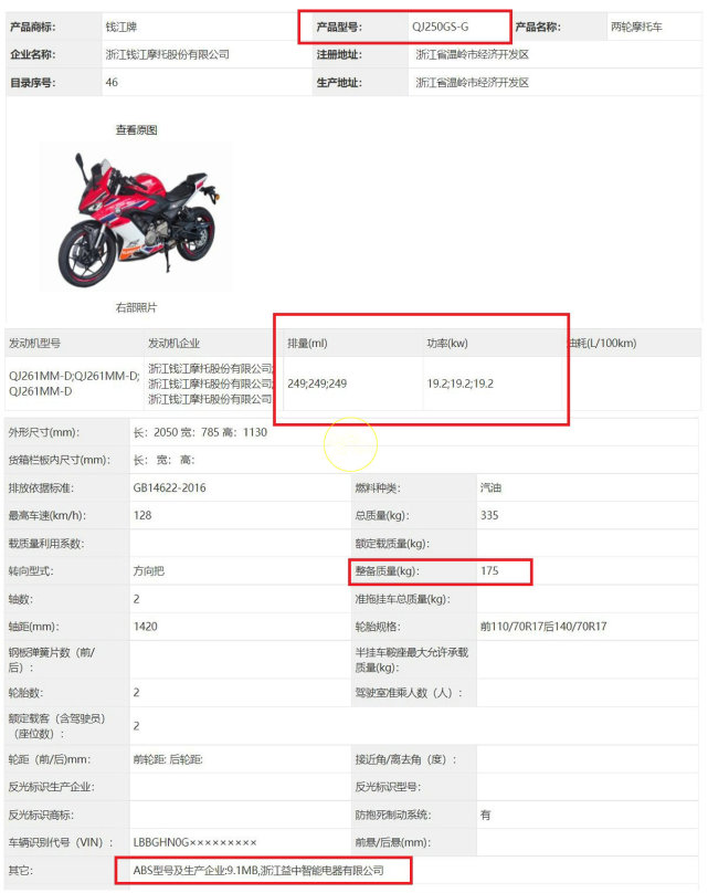 車(chē)型名稱(chēng)顯示QJ250GS-G,雙缸發(fā)動(dòng)機(jī)排量為249cc,最大功率19.2kw,最大扭矩應(yīng)該是24.1Nm,與Tornado 252R保持一致。賽250雙缸車(chē)型175kg的整備重量,還要比Tornado 252R輕了2kg,同樣標(biāo)配了雙通道ABS。為什么說(shuō)它是雙缸,因?yàn)槟壳暗膯胃踪?50只有159kg的整備重量,突然重了這么多自然出在發(fā)動(dòng)機(jī)上。至于為什么沒(méi)有配備單搖臂,想必是廠家另有考慮吧!