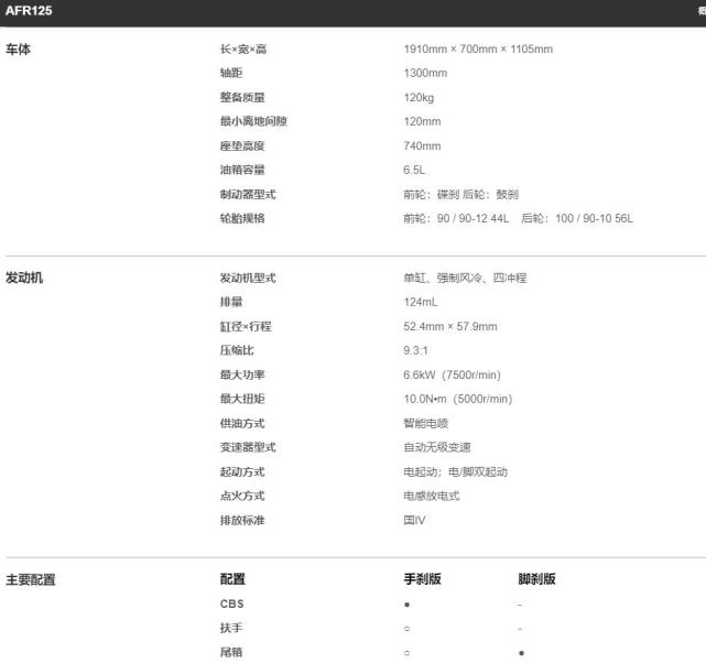 動力方面,豪爵AFR125搭載一天124cc排量的單缸風冷發(fā)動機,最大功率6.6kW/7500rpm,最大扭矩10Nm/5000rpm,動力數(shù)據(jù)和鈴木UY125相當。值得注意的是,豪爵的這款小踏板還提供了腳剎版本。