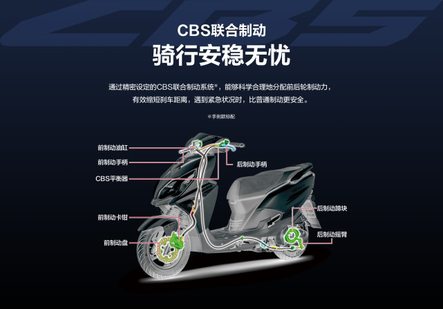 AFR125制動方面配備前后碟剎,而且搭載了CBS聯(lián)動剎車功能,沒有配備雙通道ABS也在意料之中,其實CBS在日常通勤的小踏板上完全能夠勝任。