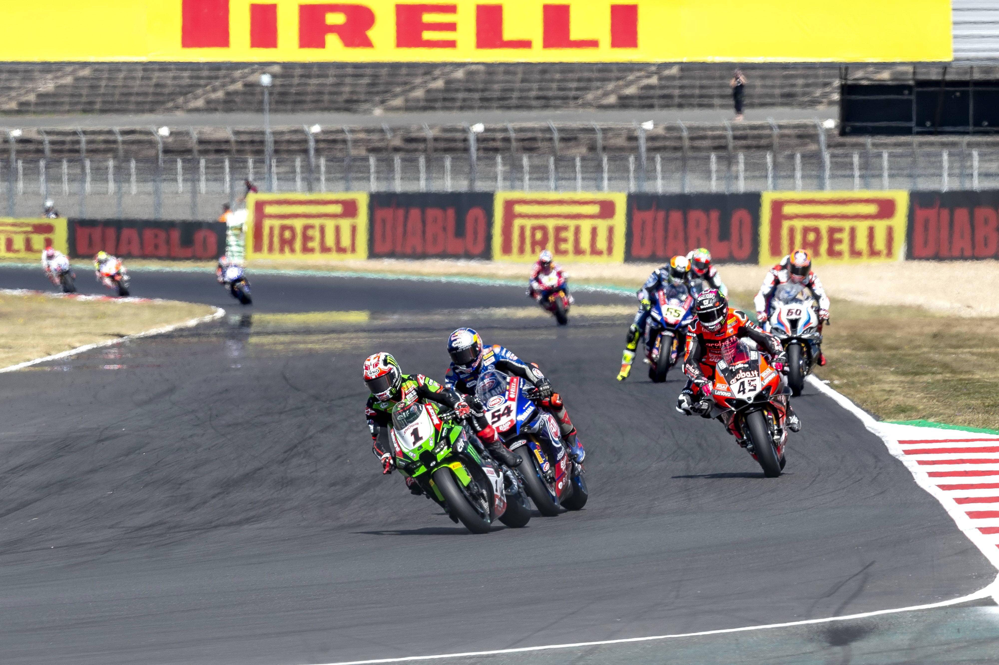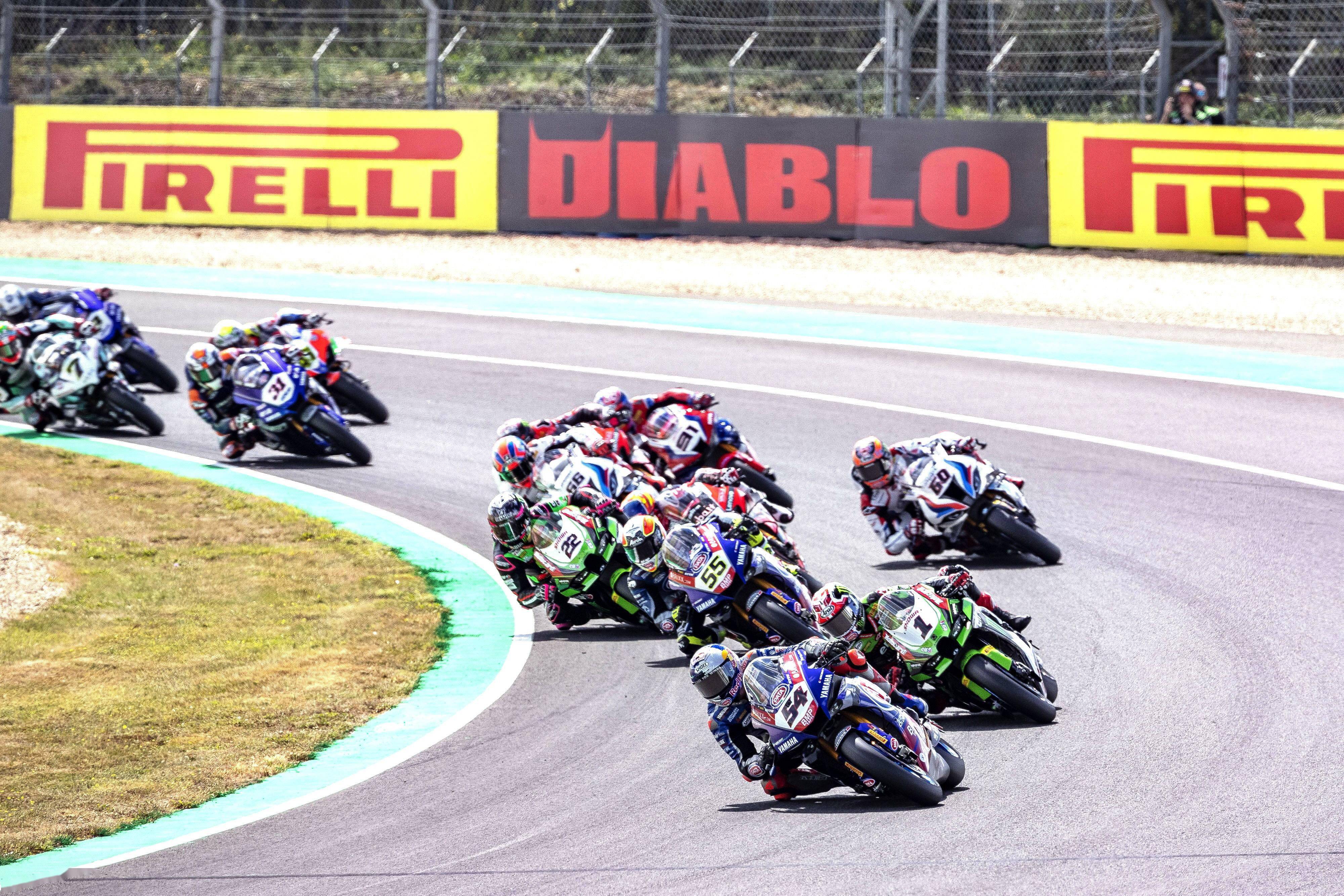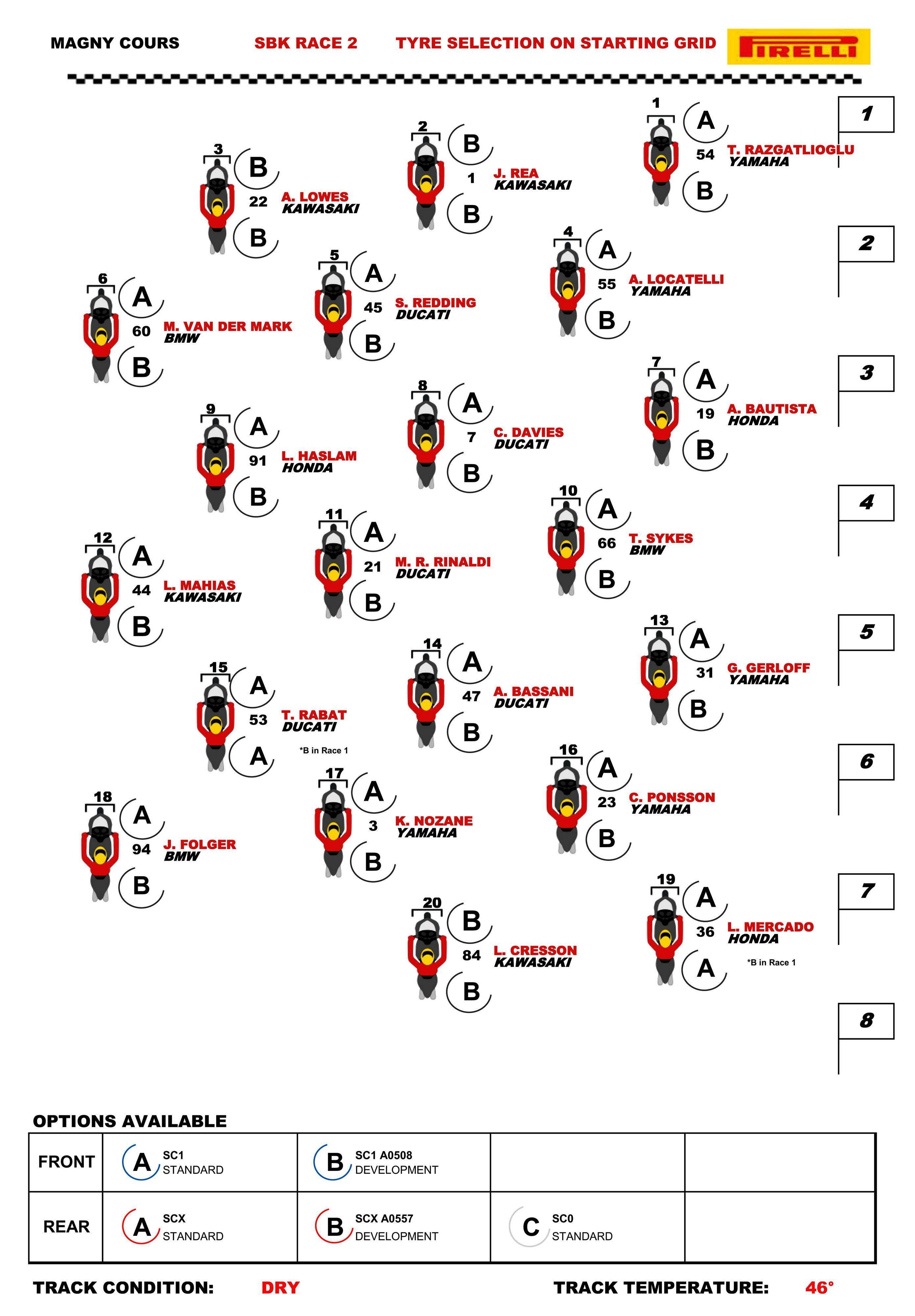 WSBK 的比賽統(tǒng)一使用 Pirelli 倍耐力的輪胎,本站的比賽,倍耐力在干地、中等路面、濕地路面三個(gè)不同狀態(tài)下,為 WSB 級(jí)別的車(chē)手,提供五個(gè)前胎、六個(gè)后胎的不同表面化合物軟硬度的選擇。