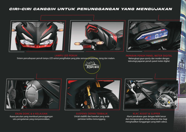 與其他市場(chǎng)的版本相比,馬來(lái)西亞的CBR150R只有兩種顏色選擇:?jiǎn)」馓炕疑吞枪麪q紅色。