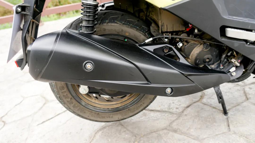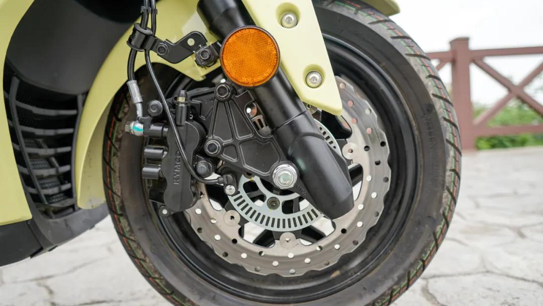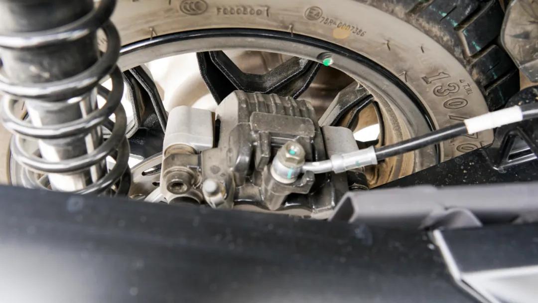輪胎規(guī)格前120/70-13,后前130/70-13,可以看出胎紋比較明顯,能略微兼顧一定的非鋪裝路。