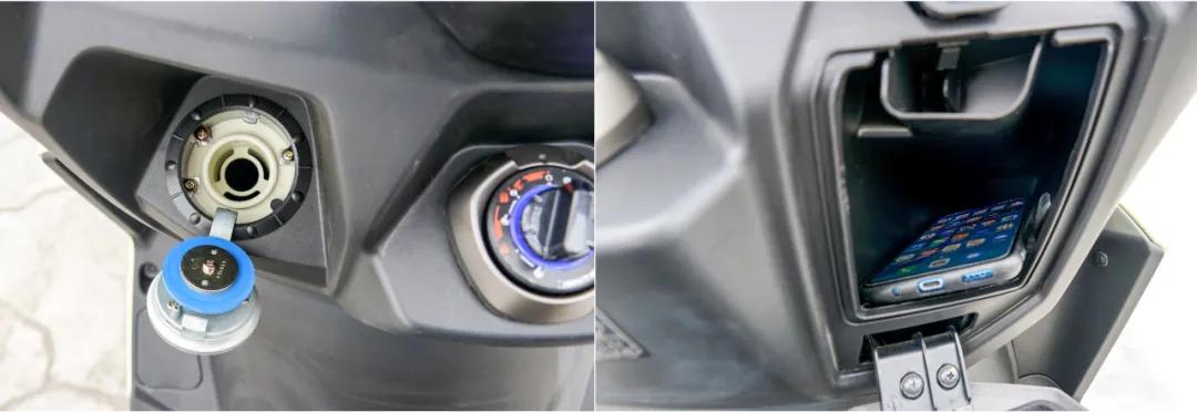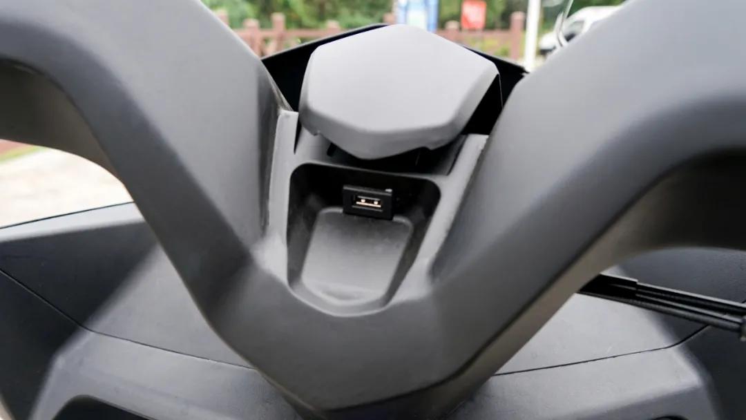 標配無鑰匙啟動系統(tǒng),手把中間蓋子打開,里面還隱藏了一個UBS接口,“順便”解決了UBS接口的防水問題。