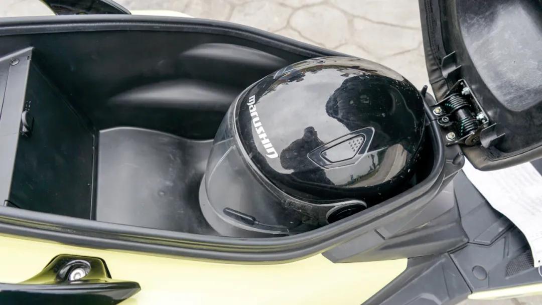 前置油箱擴大的座桶容積,放一頂3/4盔綽綽有余,還有空間放雨衣,但放全盔就蓋不上蓋子了。
