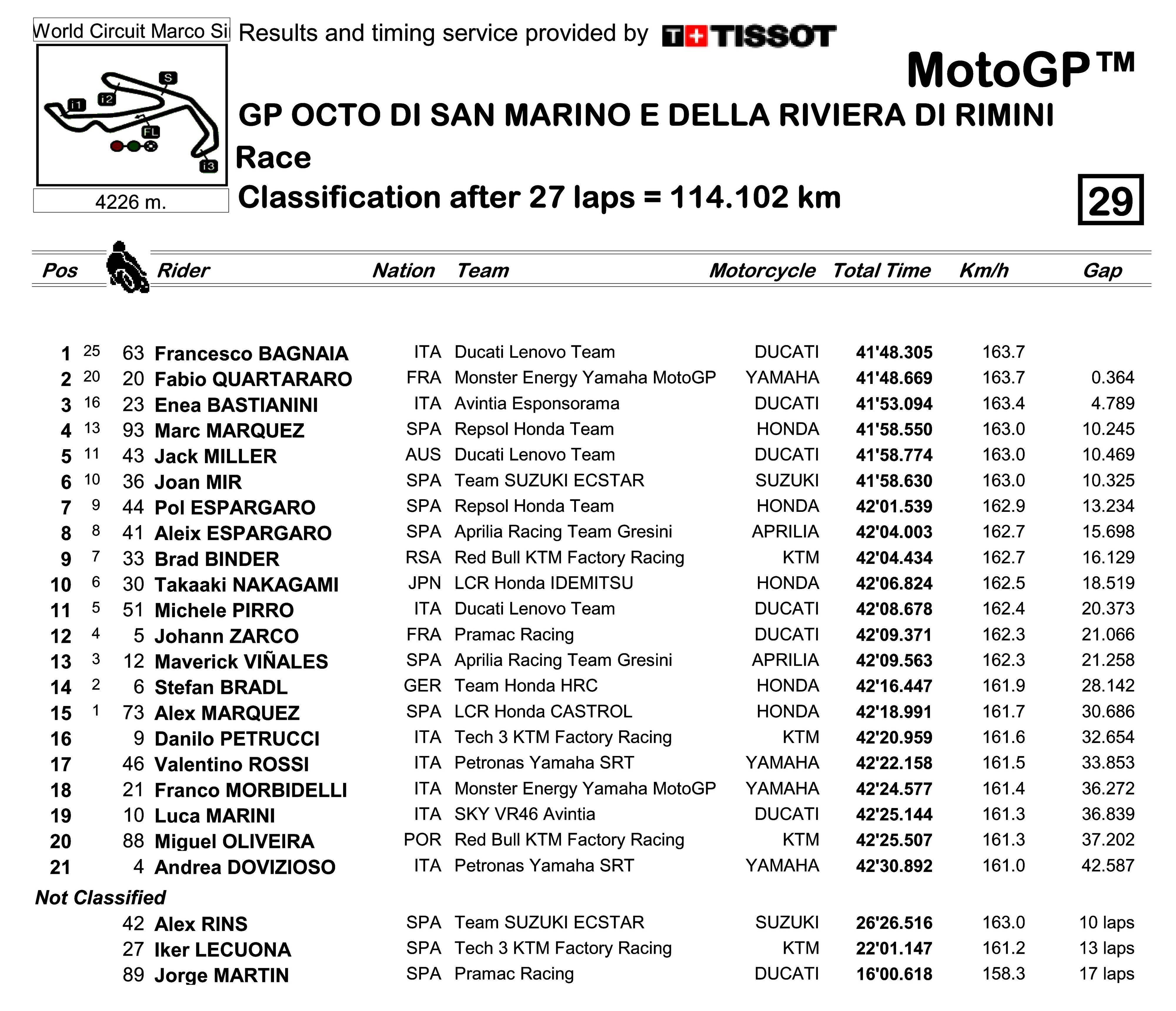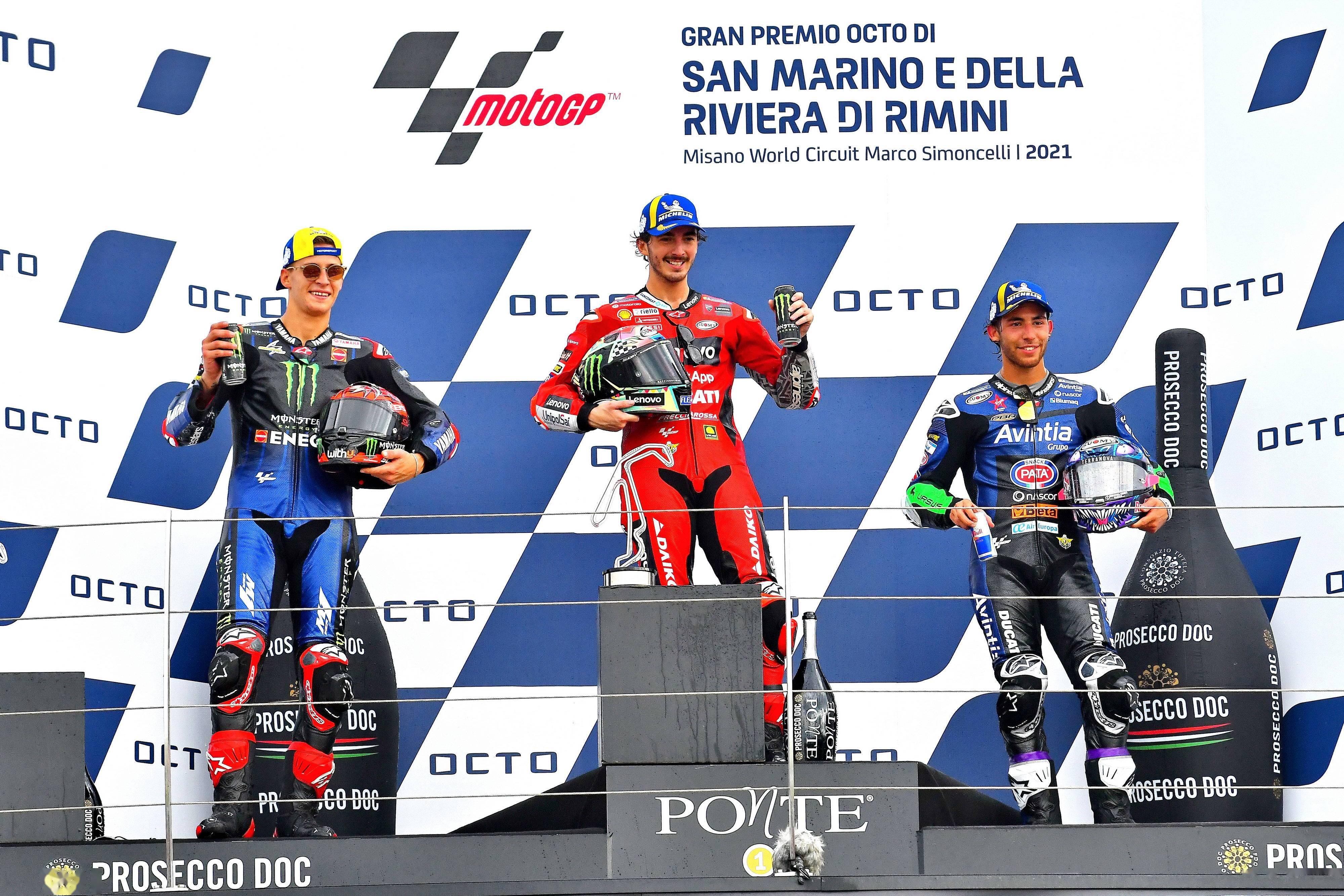 最終,巴納亞奪得了這次主場作戰(zhàn)的勝利,連續(xù)第二站拿到了冠軍。落后大約 0.3 秒,夸塔拉羅獲得了第二。在第 19 圈超越了米勒、位置升上第三的巴斯塔尼尼,也穩(wěn)住了自己的節(jié)奏,順利奪得了第三、贏得了個人在 MotoGP 級別的首次登上頒獎臺。