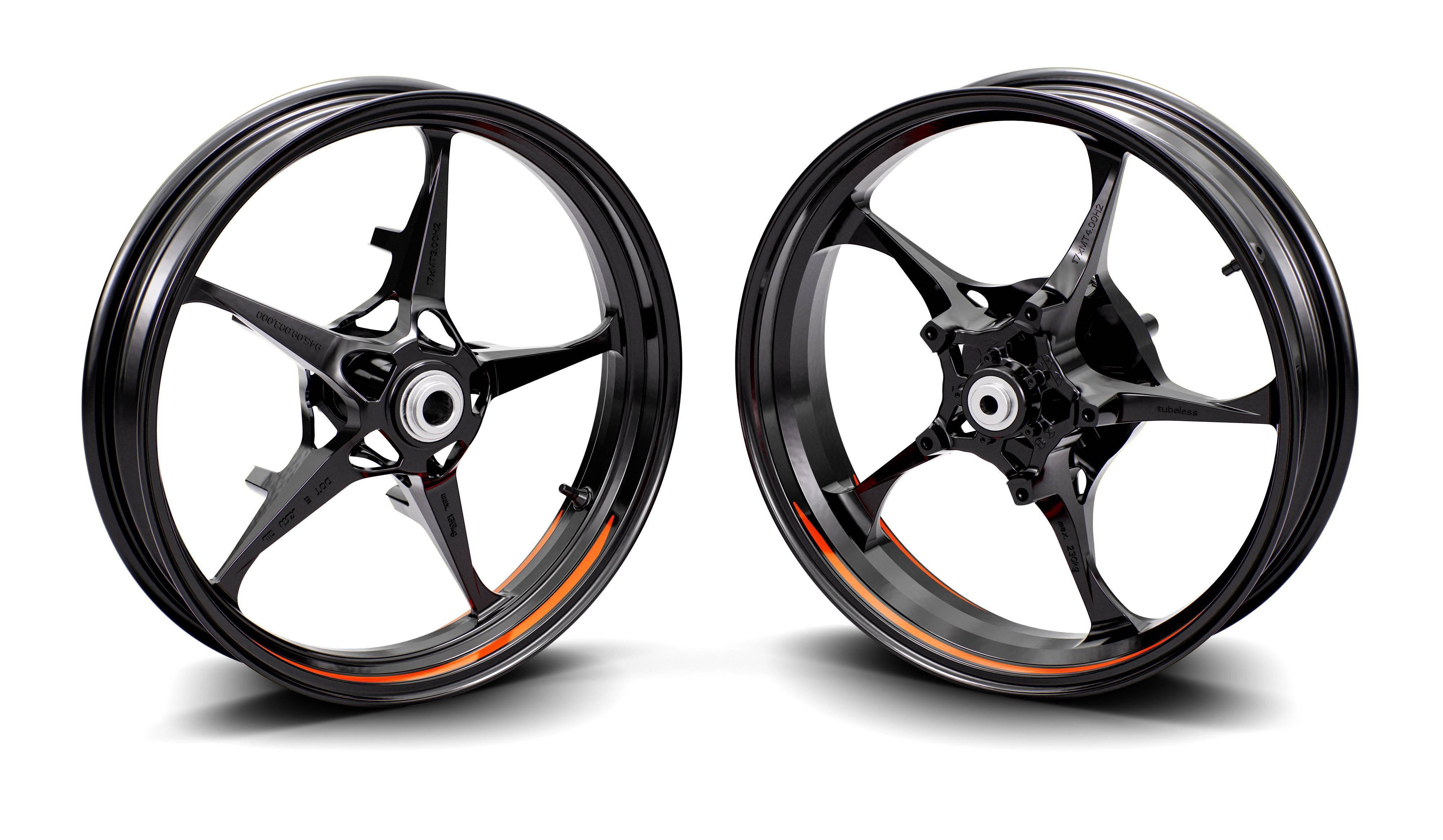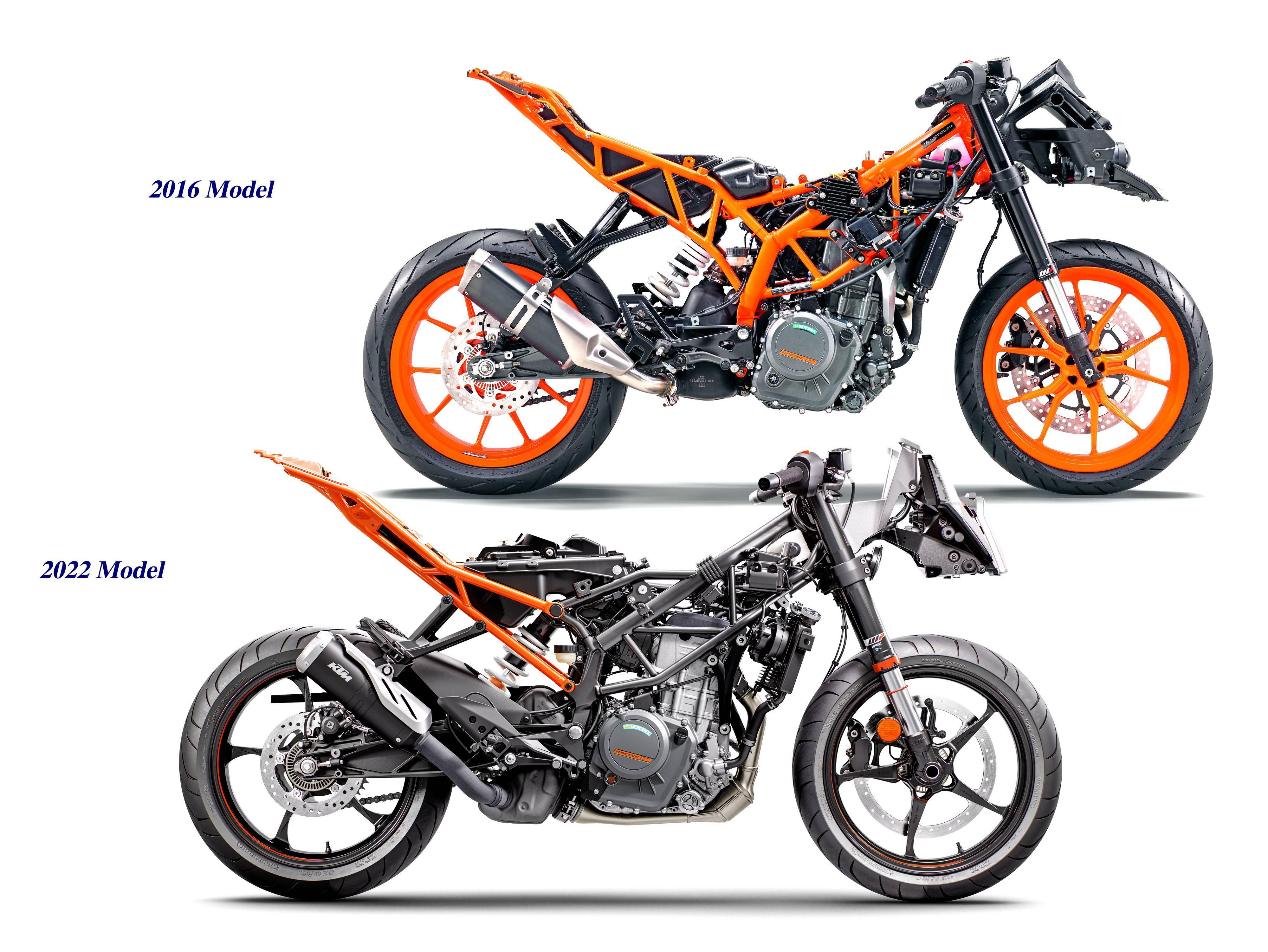 下圖:新一代 RC 系列的新車架、前叉(左為 RC390、右為 RC200/RC125)和新輪框。
