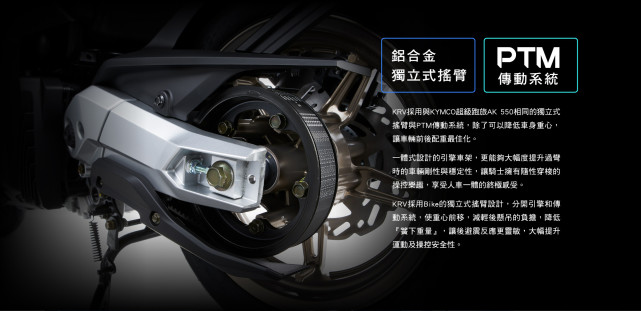 為了提升運動感,KRV采用側置單避震的形式,而且后搖臂和傳動系統(tǒng),采用與AK550相同的PTM傳動機構,外露的傳動皮帶是一大亮點,搭配鋁合金的后搖臂運動感十足。