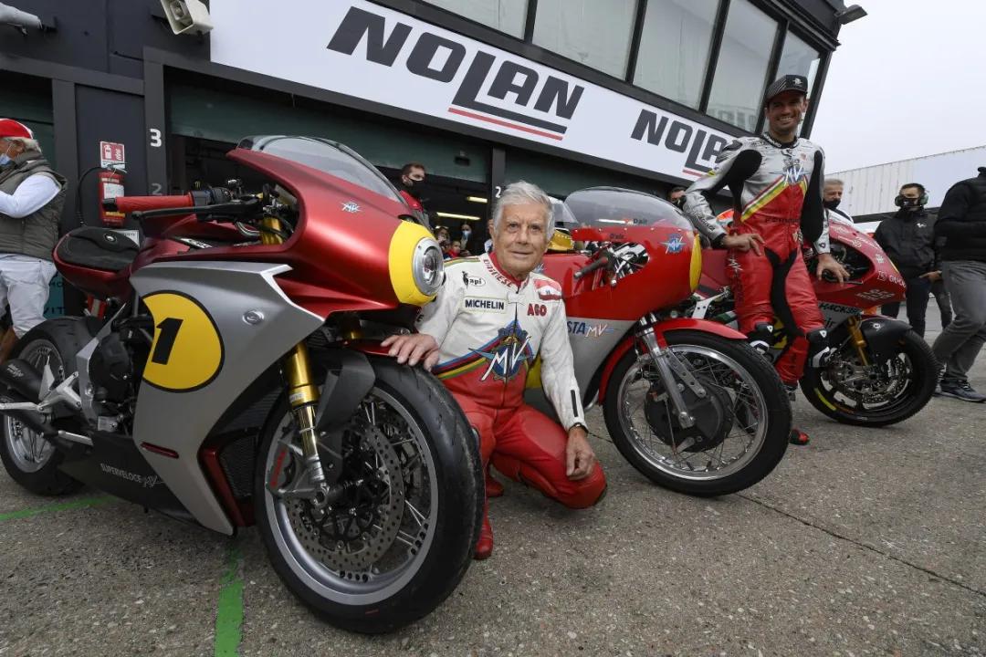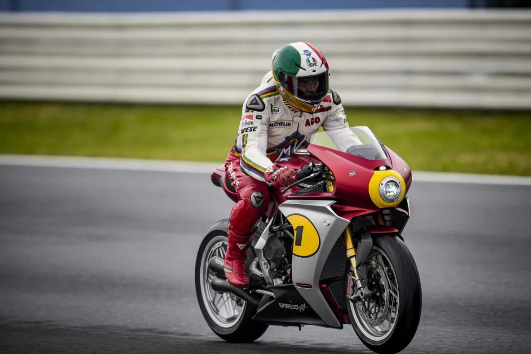 廠方在2021 MotoGP意大利Misano站發(fā)佈Superveloce Ago,并安排79歲的亞高斯丁尼(Giacomo Agostini)與MV AGUSTA的Moto2長(zhǎng)隊(duì)車(chē)手Simone Corsi ,于10月23日在賽道上巡航一圈。寶刀未老的亞高斯丁尼更穿上復(fù)古戰(zhàn)衣,佩戴AGV為他推出的復(fù)刻版頭盔,簡(jiǎn)直是絕配!