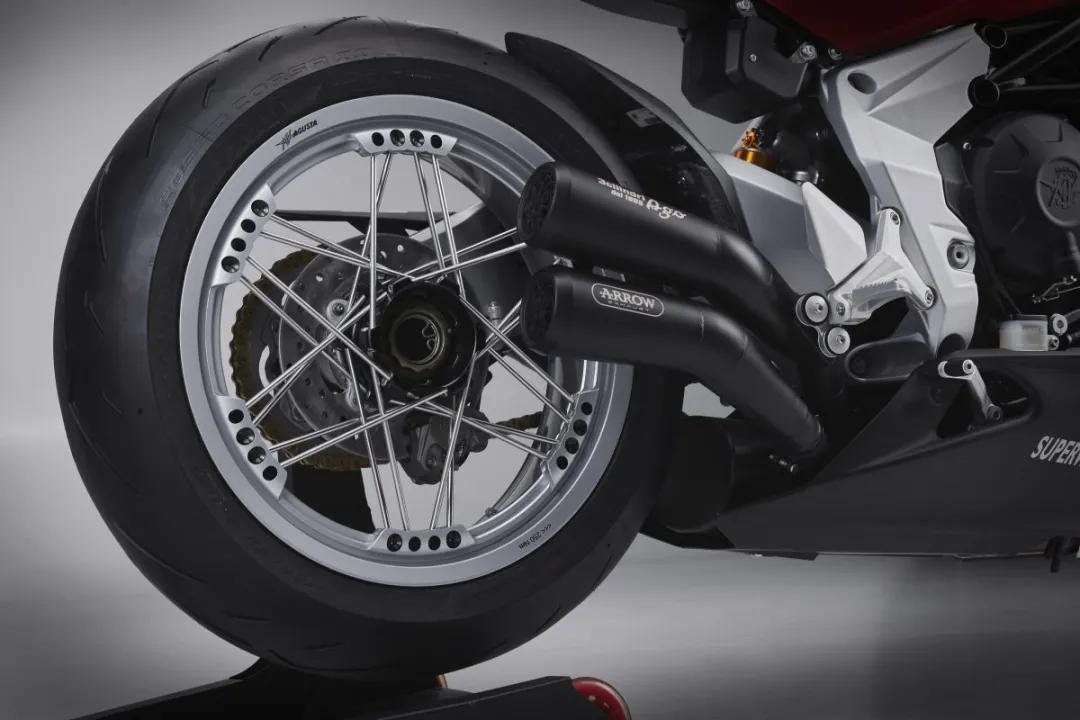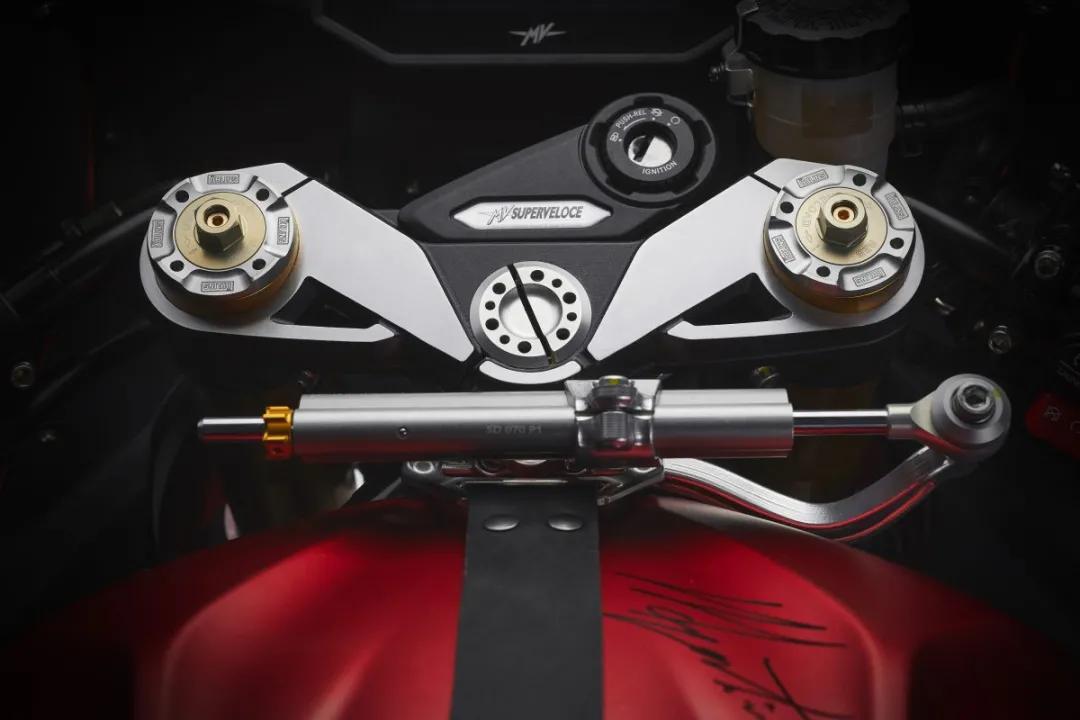 Superveloce Ago由S版為藍(lán)本,前后采用高貴的真空輻條輪,而且Superveloce Ago的配置更上一層樓,采用金黃色Ohlins Nix倒立前叉及Ohlins TTX單筒尾避震,前及后均提供回彈、下壓及預(yù)載全調(diào)校,其它版本的Superveloce都是采用Marzocchi倒立前叉,Superveloce Ago更增配了Ohlins 鈦尺,以及配置更多碳纖部件,包括兩側(cè)包圍、前后泥擋及鏈條罩等等。