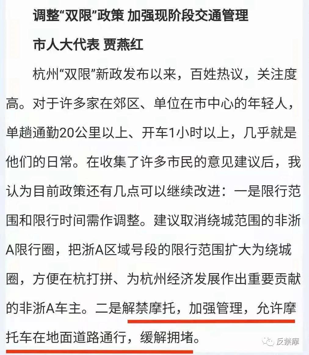 她對禁摩,提出幾點可以改進意見:1、一是限行范圍和限行時間需作調整,建議取消繞城范圍的非浙A限行圈,把浙A區(qū)域號段的限行范圍擴大為繞城圈,方便在杭打拼、為杭州經(jīng)濟發(fā)展作出重要貢獻的非浙A車主。2、是解禁摩托車,加強管理,允許摩托車在地面道路通行,緩解擁堵。