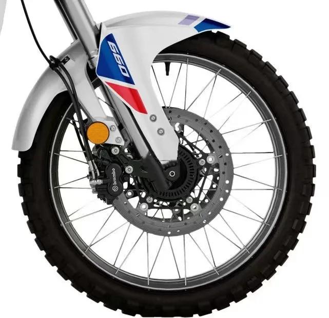 Tuareg 660軸距為1550mm,搭載全可調(diào)的43mm倒置前叉、多連桿中置后避震,前后行程均達(dá)到了240mm。前21后18寸的全地形輪胎尺寸,搭配真空輻條圈,標(biāo)準(zhǔn)的非常硬核的拉力車配置,前雙碟后單碟配備Brembo制動卡鉗保證了強(qiáng)有效的制動力,整車干重187kg,油箱容積18L,離地間隙也是達(dá)到了240mm,當(dāng)然座高也是達(dá)到了850mm。