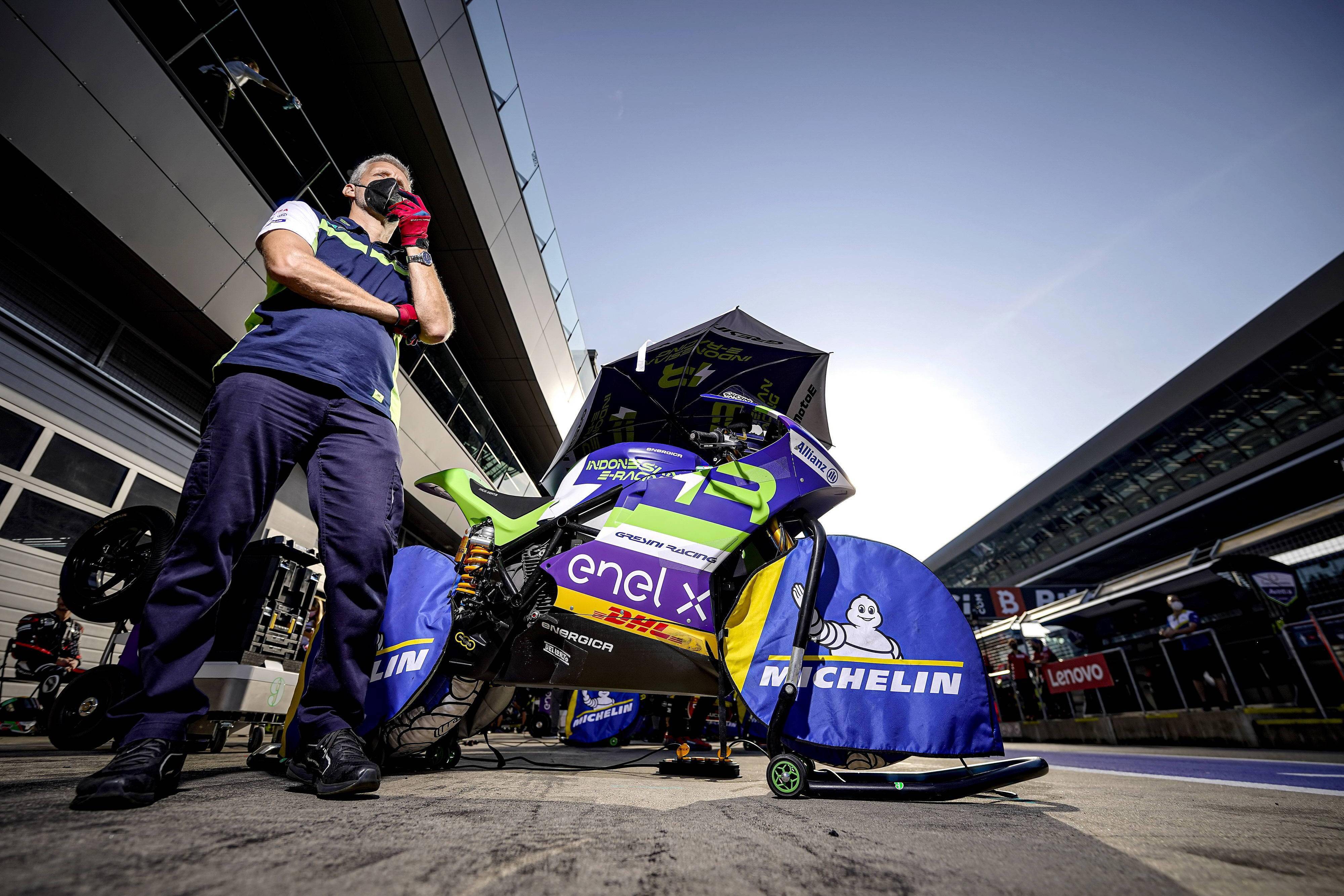 下面的圖片,F(xiàn)IM MotoE 世界杯 2021 賽季里的 Energica 電動(dòng)賽車(資料圖片)。