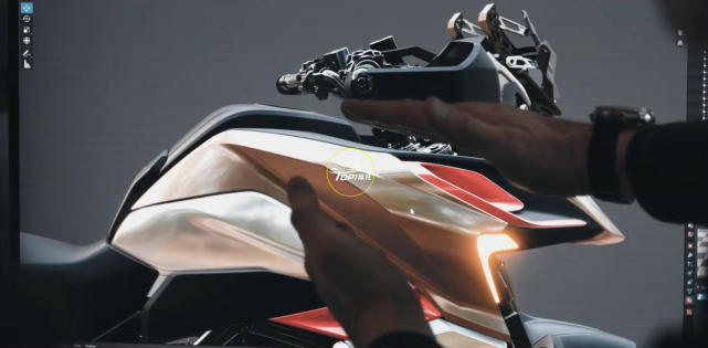 然后,設(shè)計(jì)稿將整個(gè)油箱側(cè)面露了出來,其實(shí)這個(gè)油箱設(shè)計(jì)和驍750有點(diǎn)相似之處,特別是前轉(zhuǎn)向燈的形狀和安裝位置與驍750基本一致。另外,我們還能看到原廠的手把護(hù)罩。