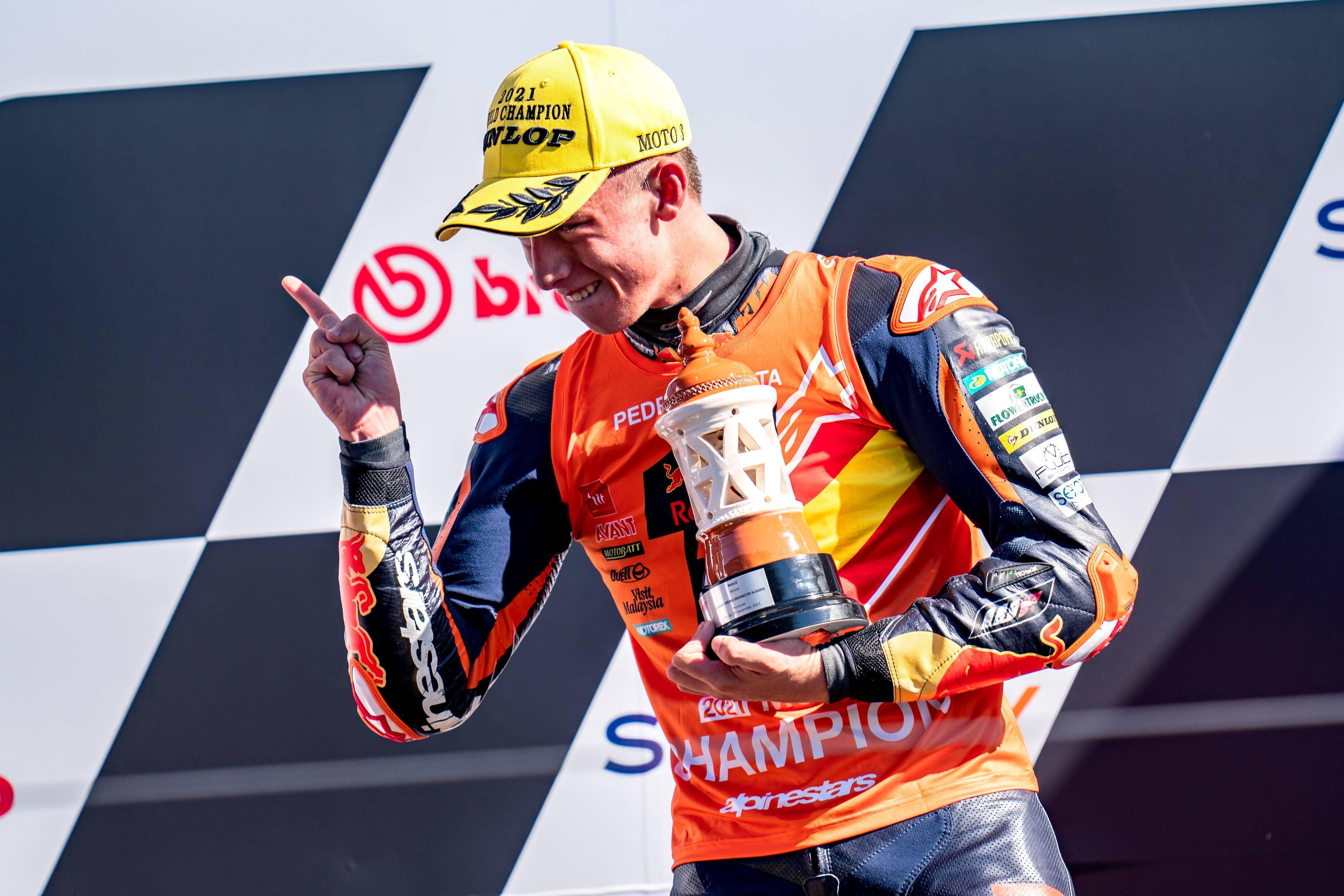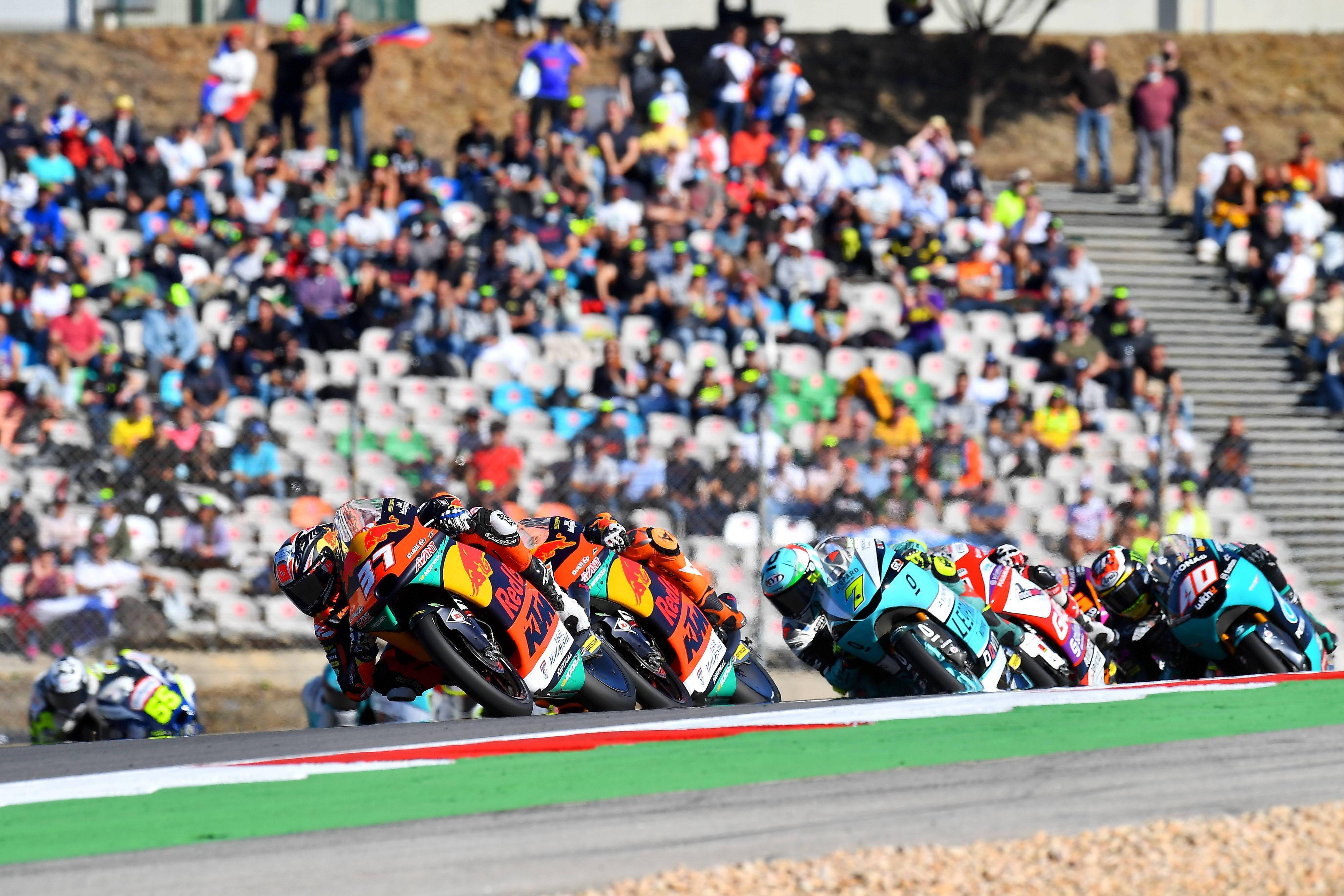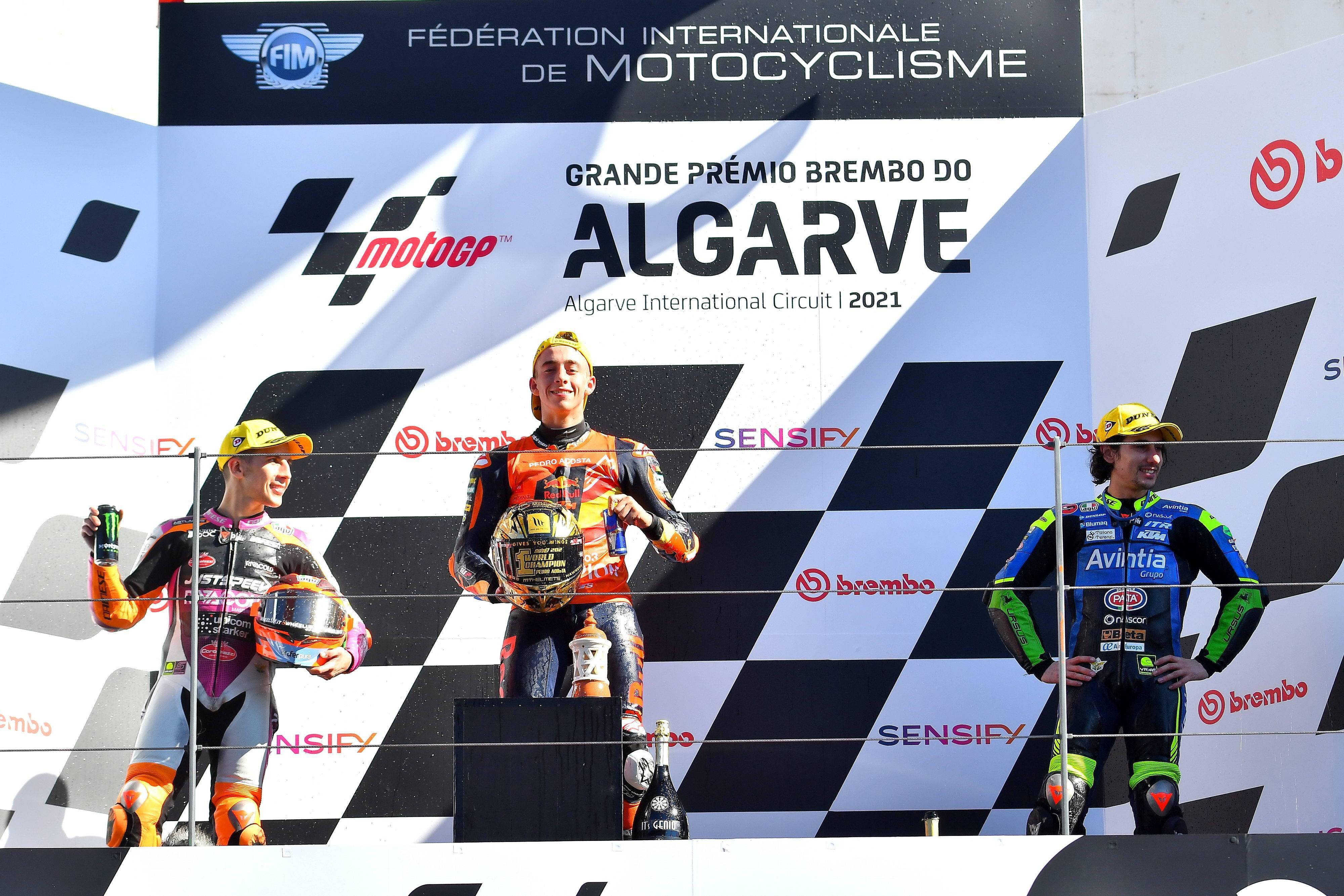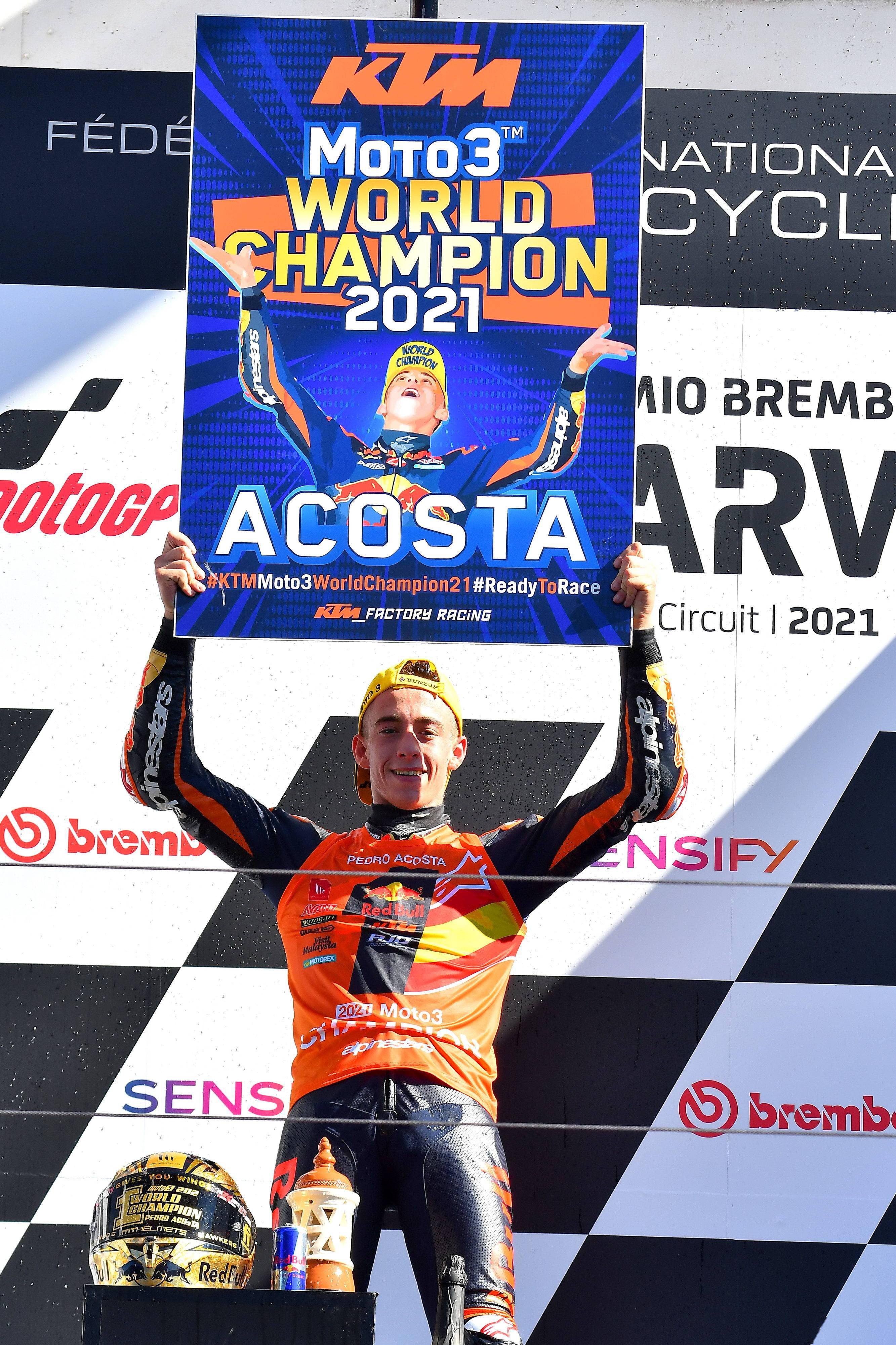 Moto3 級別,在一場一如既往的激烈較量中,主要對手霍吉亞(Dennis Foggia)在比賽的后段、因為撞車而提前退出了比賽之后,順利完賽的 37 號車、來自西班牙的阿科斯塔(Pedro Acosta)提前奪得了 2021 年度 Moto3 級別的世界冠軍(車手)。而實際上,憑借著在季初時的一鳴驚人,阿科斯塔在積分榜上已經長時間處于領先的位置上,一直就是今年的冠軍大熱門。