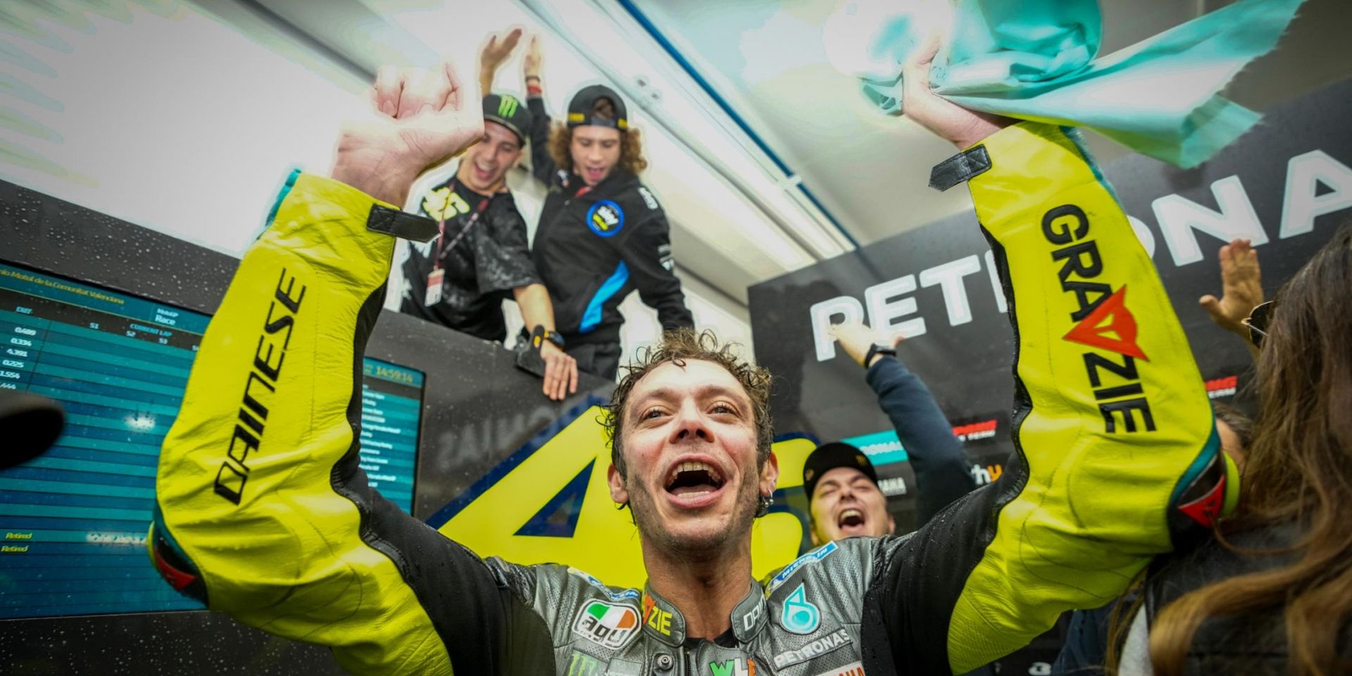 包含了擁抱、煙火以及全場七萬五千名瘋狂的觀眾,為Valentino Rossi最后的黃潮致敬,即便場上的車隊(duì)配色不同,車迷、車手以及賽場里的所有人都讓Valentino Rossi在他生涯的最后一場MotoGP比賽中感受到無比的溫暖。