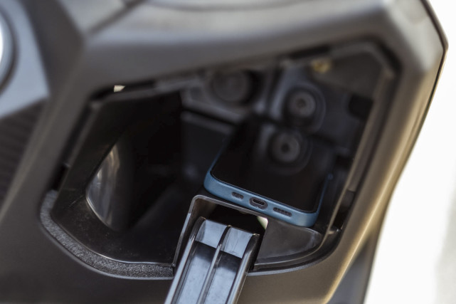 還有兩段可調(diào)的風擋,以及48L的座桶空間,能輕松放進去兩頂全盔。車輛前方也配置有手套箱,空間還不錯,內(nèi)部則有QC3.0充電口。