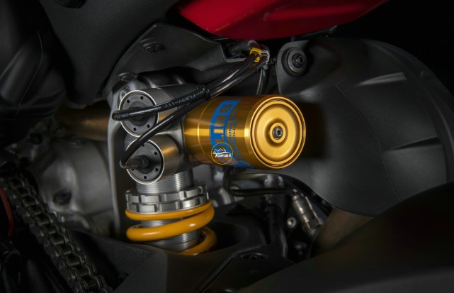 Panigale V4的懸架與老款相比沒有變化,采用完全可調(diào)的43mm昭和大活塞前叉。新款Panigale V4 S用新的Ohlins NPX 25/30電子控制加壓前叉取代了之前的NIX30前叉。源自O(shè)hlins的賽車前叉,NPX 25/30使用了一種新的加壓筒式阻尼系統(tǒng),杜卡迪聲稱該系統(tǒng)可改善制動支持、具備更好的顛簸吸收,并增加對賽道上要求苛刻的制動部分的反饋。