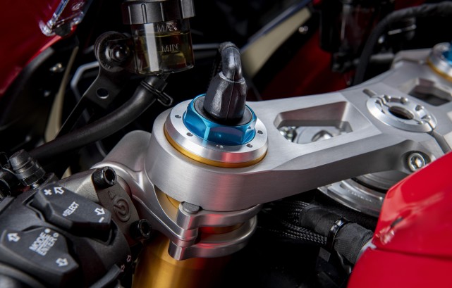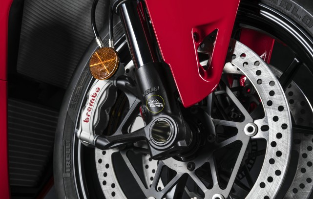 制動系統(tǒng)與老款相比沒有變化,兩個V4 車型都配備了雙徑向安裝的Brembo Monoblock Stylema M4.30前四活塞卡鉗和后雙活塞卡鉗,Bosch Corning ABS EVO系統(tǒng)則是標(biāo)準(zhǔn)配置。