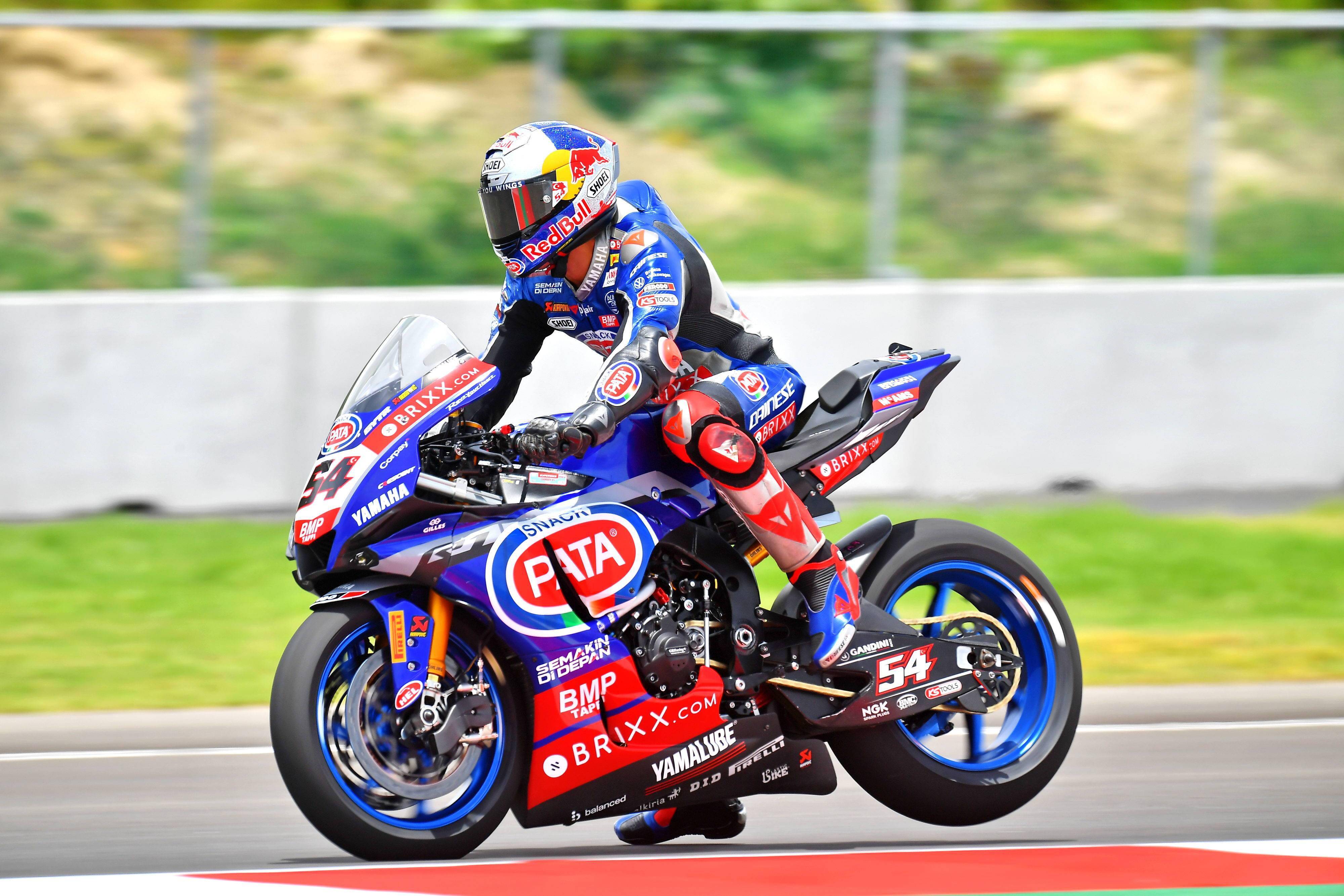 WSB 級(jí)別,賽前的 Supole 超級(jí)排位賽,今年世界冠軍的大熱門、積分榜上的領(lǐng)先者,土耳其車手拉格里奧盧(Toprak Razgatlioglu)跑出了 1 分 32.877 秒的最佳圈速,拿到了第一節(jié)比賽的排頭位出賽。