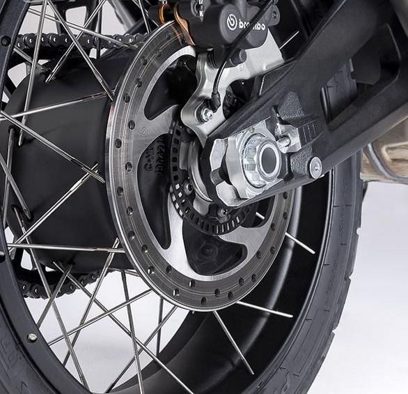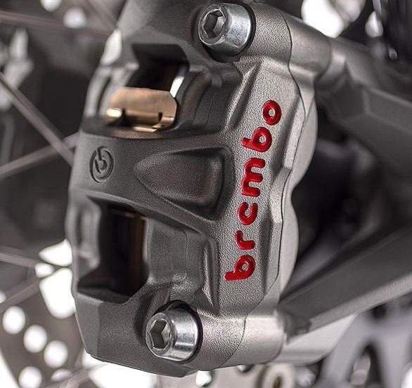 前制動系統(tǒng)為雙 Brembo M50 輻射卡鉗搭配 320mm 碟盤,這規(guī)格嘛... 或許 Off Road 剎車得拉小力一點(diǎn)。