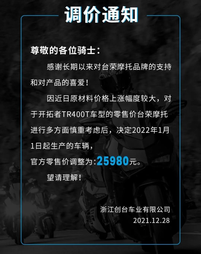 昨天,宣布調(diào)整售價(jià)的還有來(lái)自浙江的臺(tái)榮,將旗下的大踏板車型TR400T的價(jià)格從23980元,上調(diào)至25980元,漲幅2000元!臺(tái)榮給出的解釋是原材料價(jià)格上漲,如果真實(shí)的原因的確如此,那么可能還會(huì)有更多的品牌會(huì)調(diào)整價(jià)格,2021年的價(jià)格戰(zhàn)告一段落,2022年的漲價(jià)潮要開始了嗎?