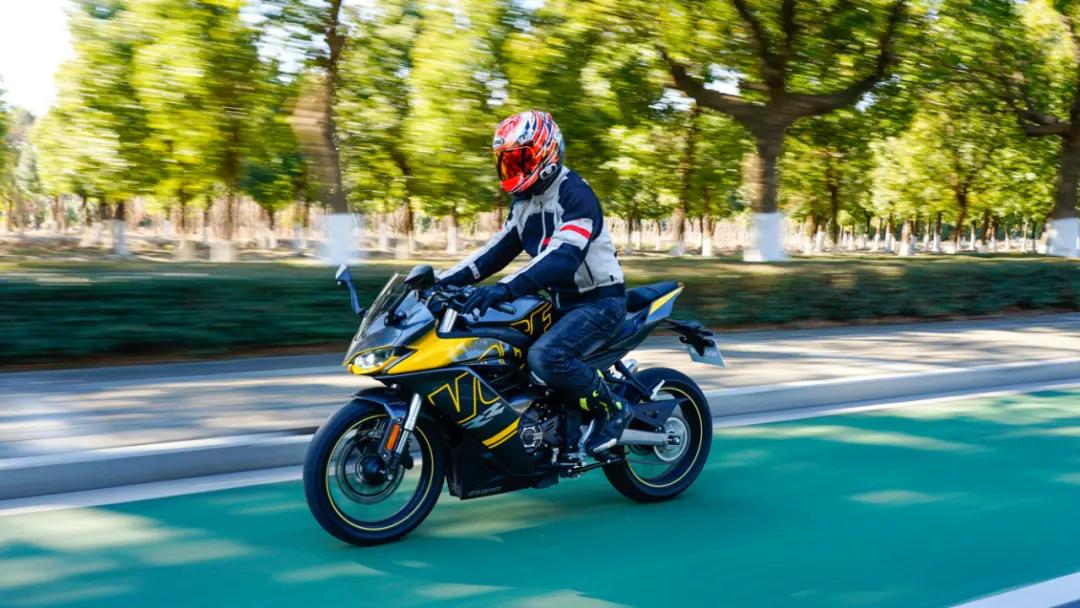 騎行三角如圖,腰部略直立,正常騎乘不會有太多的勞累感,周末來一趟小短途也是沒有問題的。僅147kg的重量在走街中,加分不少,操控輕松,加上它的轉(zhuǎn)向舵角比一般仿賽車型更大,所以走街串巷、車流中超車會很輕松。