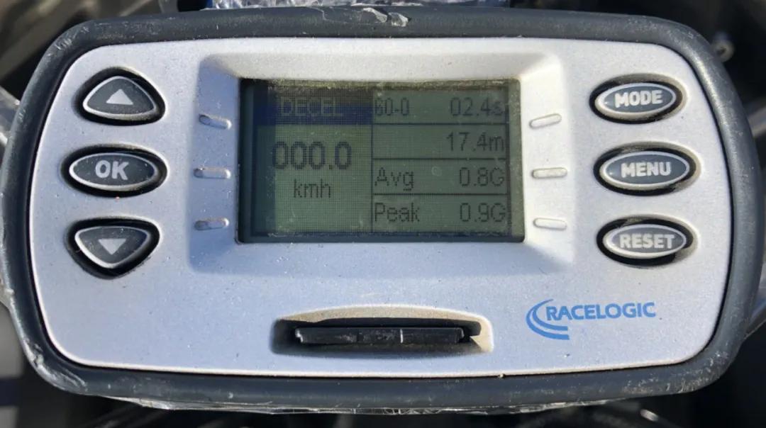 測試當天,氣溫是零下5度,所以也在擔心輪胎的抓地不足,在跑了一陣暖胎之后,測了多次制動。測得60km/h至0的最好成績?yōu)?7.4m,30km/h至0的最好成績?yōu)?.6m(三七同學的成績是15.8m和4.2m),制動過程中,輪胎的表現(xiàn)很不錯,穩(wěn)定的咬住地面,沒有絲毫打滑,甩尾的狀況出現(xiàn)。