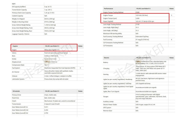 根據(jù)泄露的規(guī)格表來看,新款Low Rider S在4,750轉(zhuǎn)時爆發(fā)出103匹馬力,這與2021 CVO車型上的Milwaukee-8 117發(fā)動機的功率差不多。峰值扭矩在3,500轉(zhuǎn)時輸出為169Nm,與2021 FXLRS 相比所增加,爆發(fā)轉(zhuǎn)速也延后了500轉(zhuǎn)。