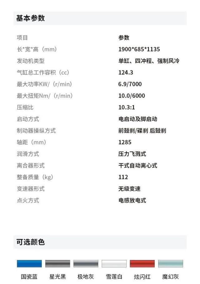 動力方面,搭載124.3cc排量的單缸風(fēng)冷發(fā)動機(jī),這臺發(fā)動機(jī)已經(jīng)在另外兩個兄弟車型上得到了充分地驗證和考驗。最大功率6.9kw,最大扭矩10Nm,數(shù)據(jù)并沒有很搶眼,但是耐久性和燃油經(jīng)濟(jì)性堪稱同級標(biāo)桿。