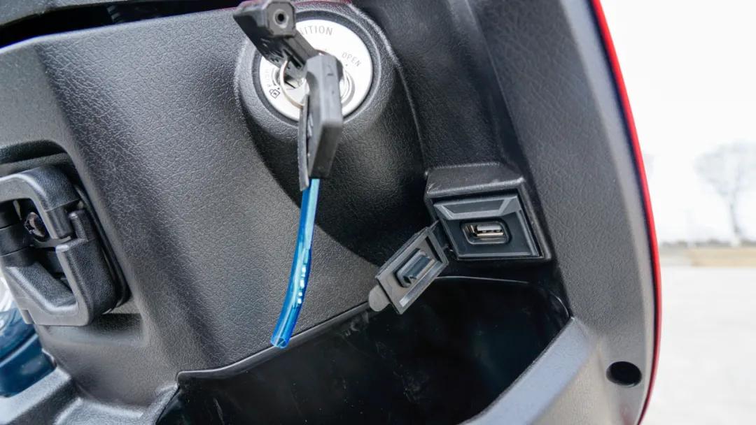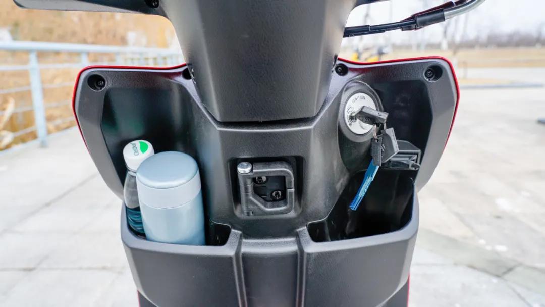 而UE125的實(shí)用性卻也毫不含糊,鑰匙下方兩個(gè)大大的敞口手套箱容積非??捎^,放個(gè)三兩瓶水絲毫沒有問題,敞口的設(shè)計(jì)也便于拿取物品。右側(cè)手套箱上方還設(shè)計(jì)了USB接口,方便手機(jī)等用電器放在手套箱中充電。電門鎖則是常規(guī)的磁石鑰匙,具有一定的防盜功能,并且一體鎖的設(shè)計(jì)也方便開啟座墊加油等操作。