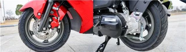 行走系統(tǒng)部分,依舊采用了前90-90-12后100-90-10的輪胎尺寸搭配誠遠(yuǎn)品牌防滑胎,輪轂樣式則采用了和UY125一樣的帶有CNC銑削工藝的鋁合金輪轂,而前大后小輪的搭配,營造出車身“昂首向前”的姿態(tài),也讓整車運(yùn)動氛圍更盛。
