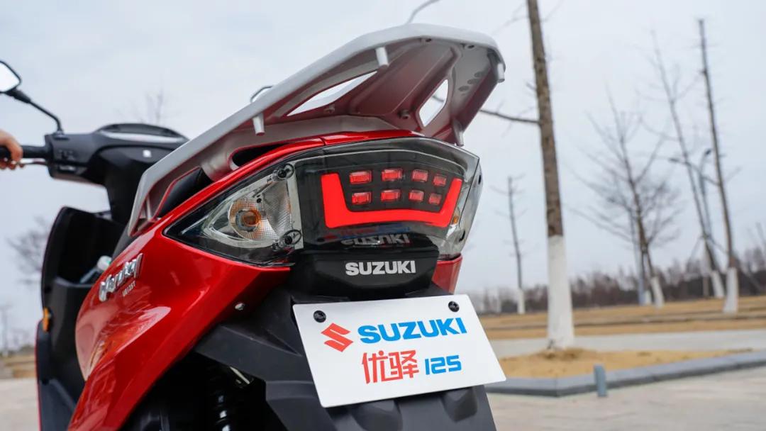 尾燈為全新設(shè)計(jì),并且采用LED光源,多點(diǎn)式的剎車燈與U型尾燈配合熏黑燈殼,辨識度極高,也是時(shí)尚運(yùn)動的特征之一。當(dāng)然不出意外的,兩側(cè)轉(zhuǎn)向燈依舊為鹵素光源,不過這也是該價(jià)位踏板車型的通用做法。尾燈下方的SUZUKI標(biāo)識是“身份的象征”!