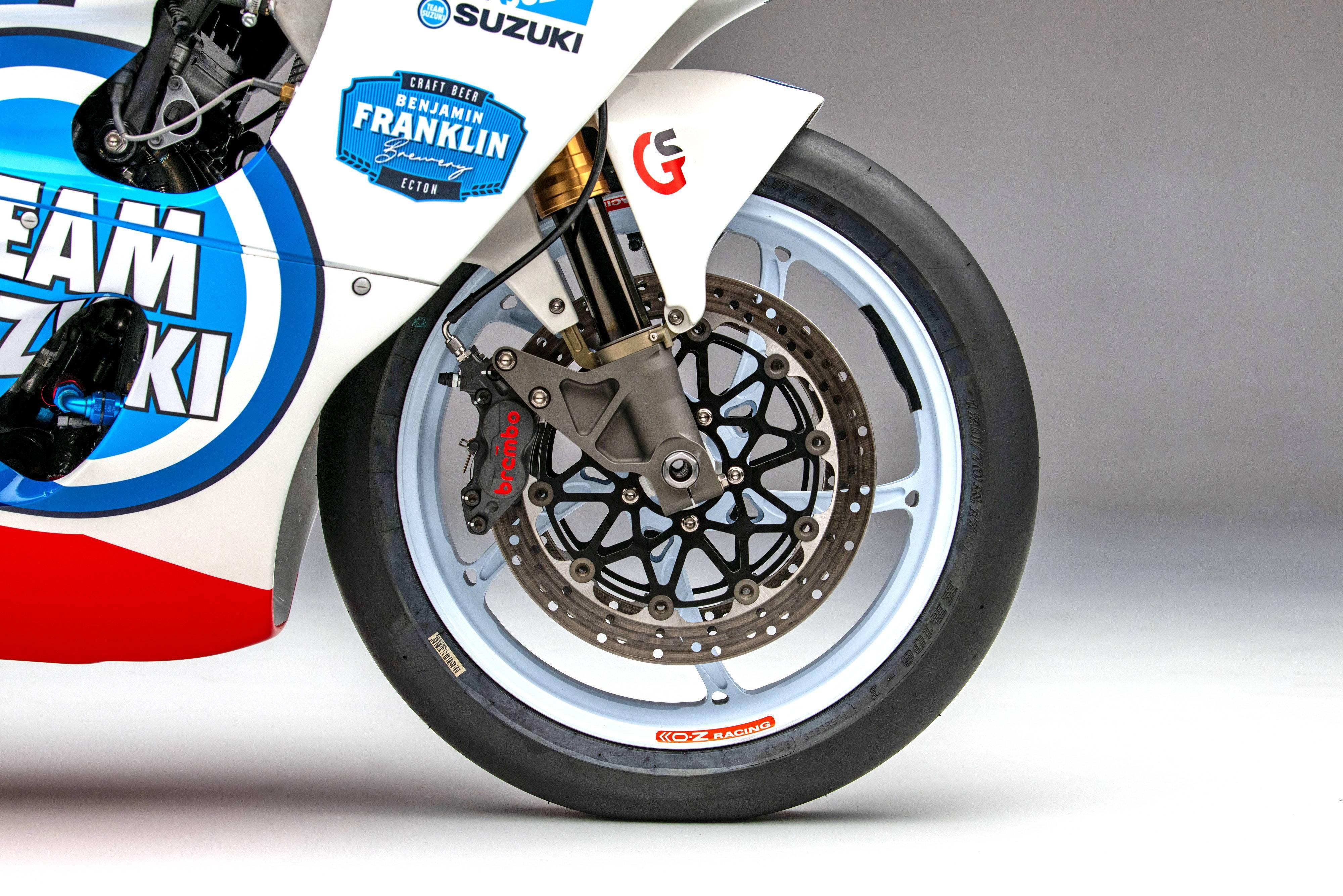1、全碳纖維復合材料制的外殼組件。而外觀圖案的設計靈感,則是來自 WGP500 年代的工廠賽車 RGV500 身上的標志性設計 Lucky Strike “ 好彩 ”;