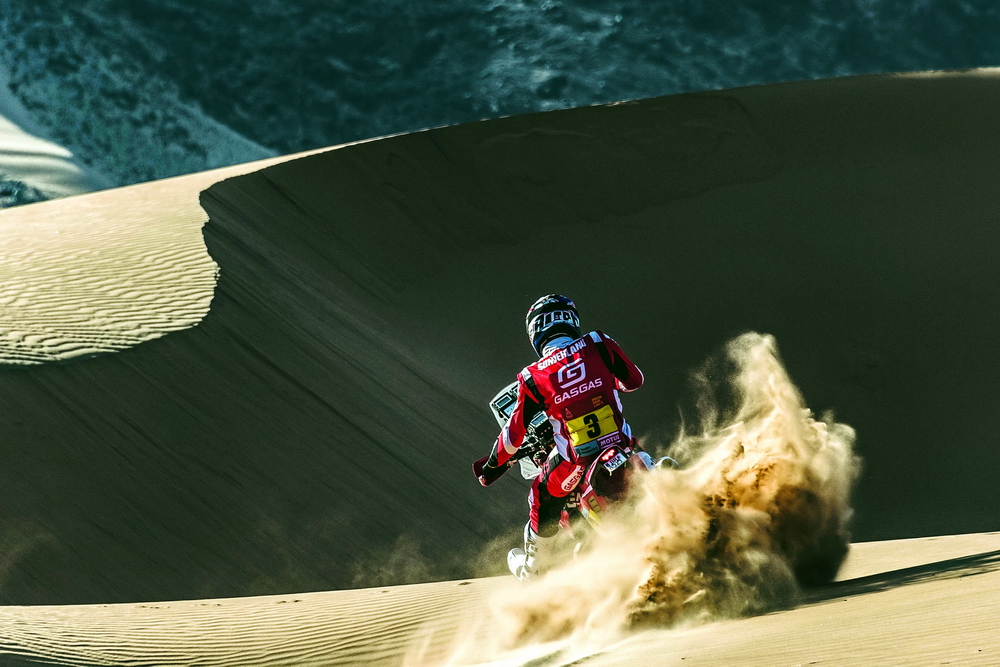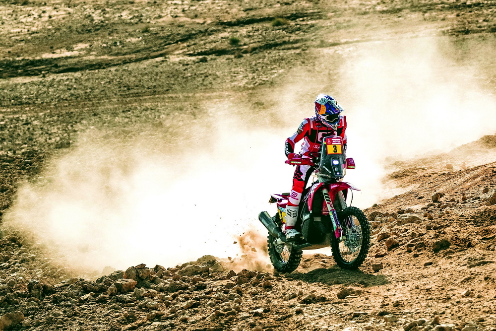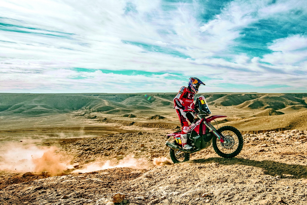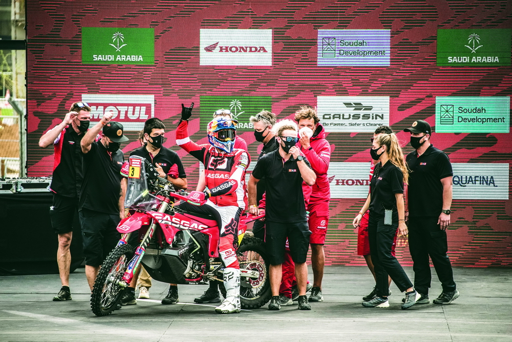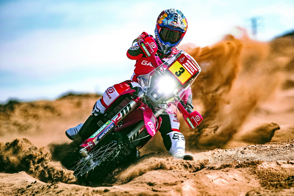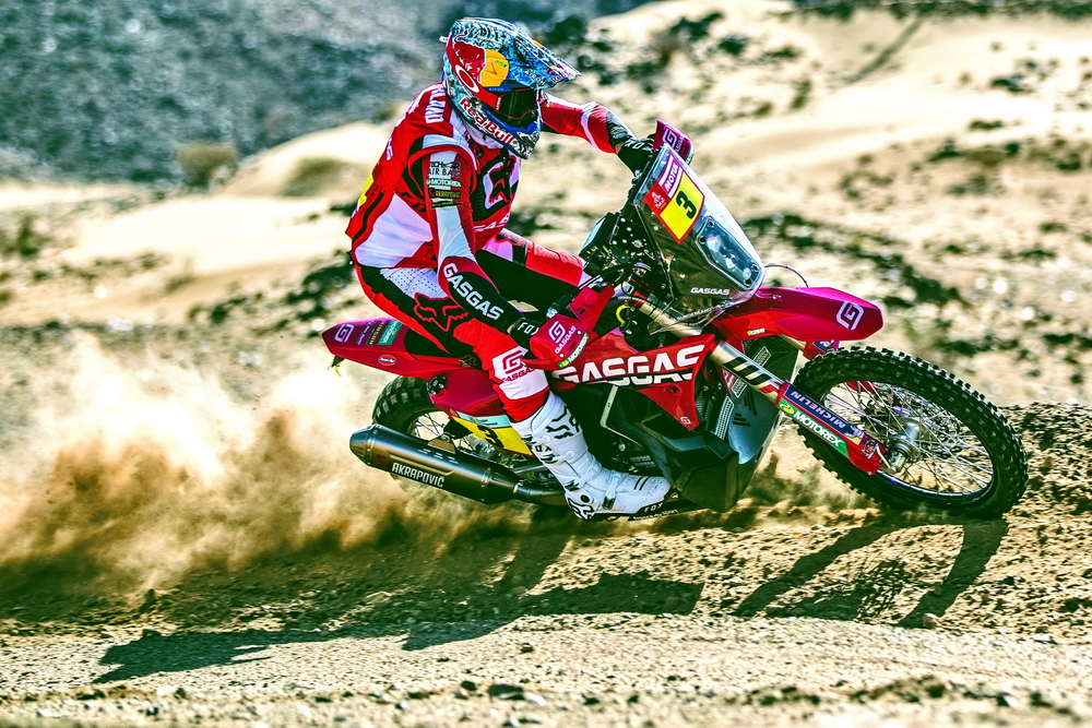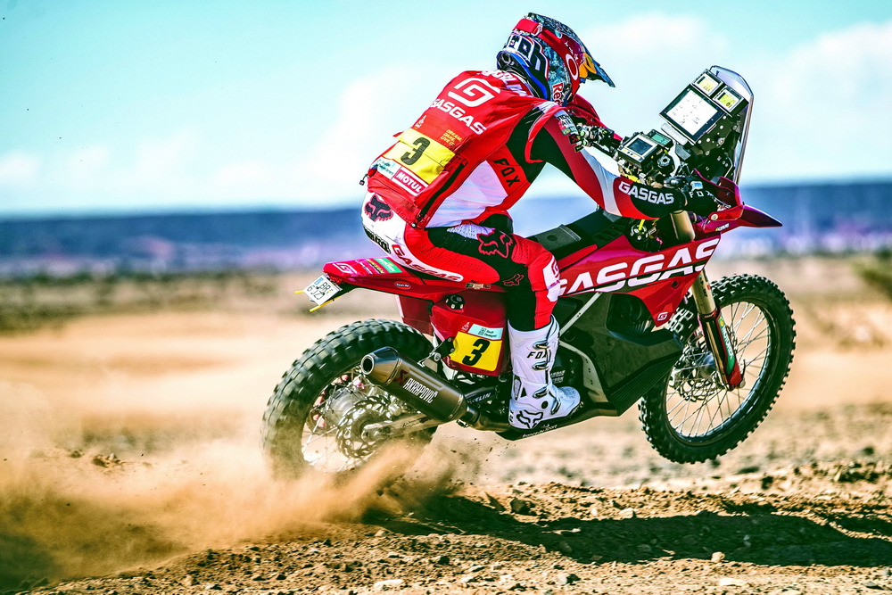 GasGas 工廠車隊(duì)的兩位車手,3 號(hào)車、來(lái)自英國(guó)的桑德蘭(Sam Sunderland),以及 4 號(hào)車、來(lái)自澳大利亞的桑達(dá)斯(Daniel Sanders),在比賽一開(kāi)始的時(shí)候就有了一個(gè)讓人驚訝的亮相:桑達(dá)斯拿到了第一賽段(Stage 1B)的冠軍,而桑德蘭拿到了第二賽段的第二、進(jìn)站總時(shí)間的榜首,并把這一名次維持到第六賽段的結(jié)束。第六賽段,桑達(dá)斯奪得了他在本屆比賽的第二次賽段冠軍,總時(shí)間也升到總排名的第三位。至此、GasGas 工廠車隊(duì)堪稱有了一個(gè)令人眼前一亮的表現(xiàn)。