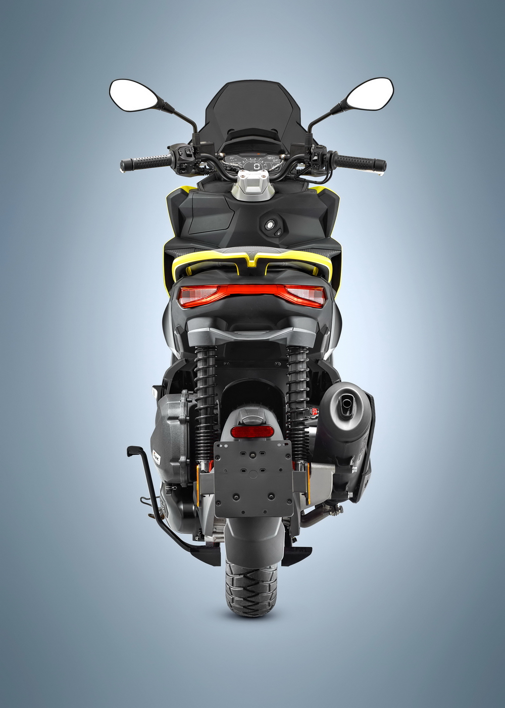 其他的配置,包括了全 LED 的燈光系統(tǒng),LCD 數(shù)字式的儀表板,前 14、后 13 英寸直徑的輪框,去除了傳統(tǒng)的啟動裝置、采用直接聯(lián)接到曲軸之無刷電機(jī)的啟停系統(tǒng) RISS(Regulator Inverter Start & Stop System,變頻調(diào)節(jié)啟停系統(tǒng)),越野風(fēng)格的裸露式車把,外掛式設(shè)計的前風(fēng)擋等。