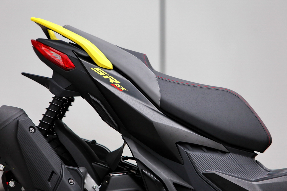 沒有采用平直的中間踏板(估計是不希望客戶用這車來送煤汽瓶)、再加上粗壯的前叉三星(前叉三角臺/前叉上下聯(lián)板),只看一眼便可明白,SR GT 125/200 的基礎(chǔ)設(shè)計理念就是運(yùn)動騎行。
