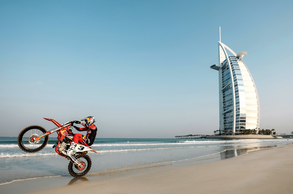 去年十月底的時候,來自英國的拉力賽車手桑德蘭(Sam Sunderland)抵達阿拉伯聯(lián)合酋長國城市迪拜進行賽前訓(xùn)練期間,在贊助商的支持下,進行了一個名為 Yalla project、帶有宣傳當(dāng)?shù)芈糜翁厣囊曨l拍攝。這位 2017 年達喀爾拉力賽冠軍、并隨后的 2021 年比賽中也獲得勝利的車手,先后穿過了迪拜的沙漠沙丘、高爾夫球場和購物中心,而另一項壯舉是登上了當(dāng)?shù)氐臉?biāo)志性建筑、哈利法塔(Burj Khalifa Tower)的頂端。