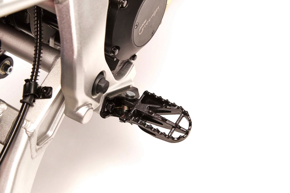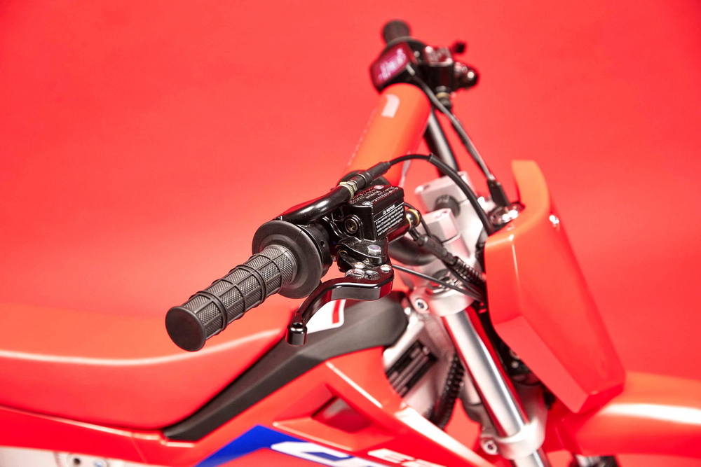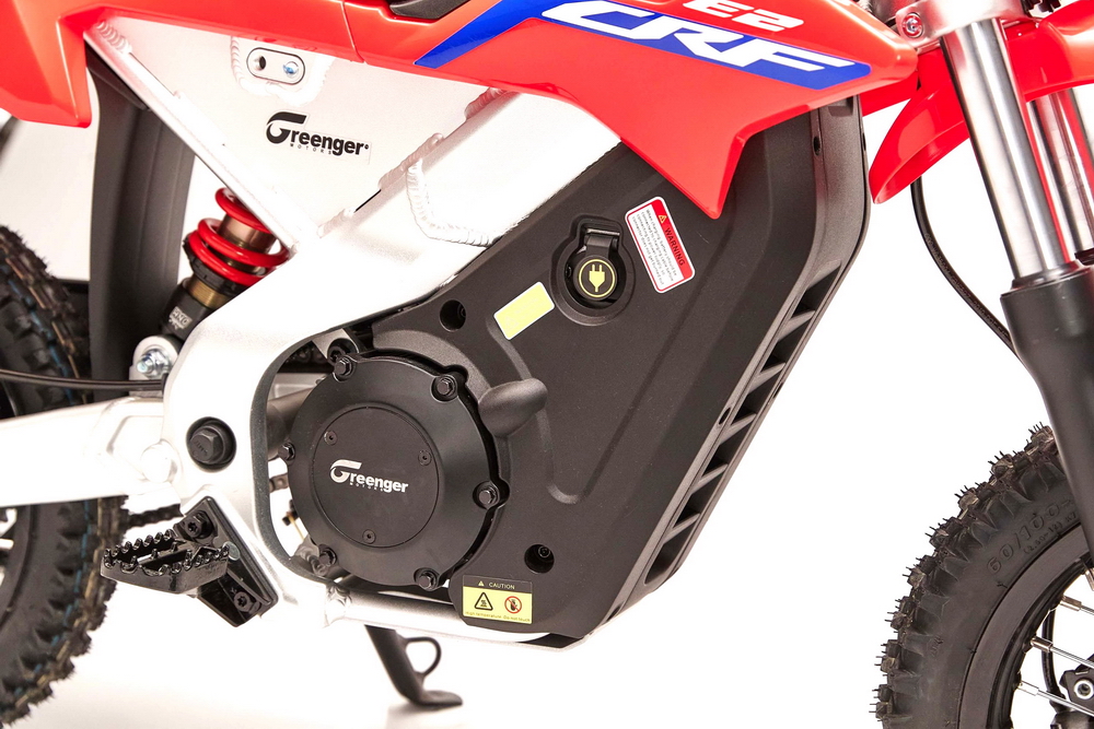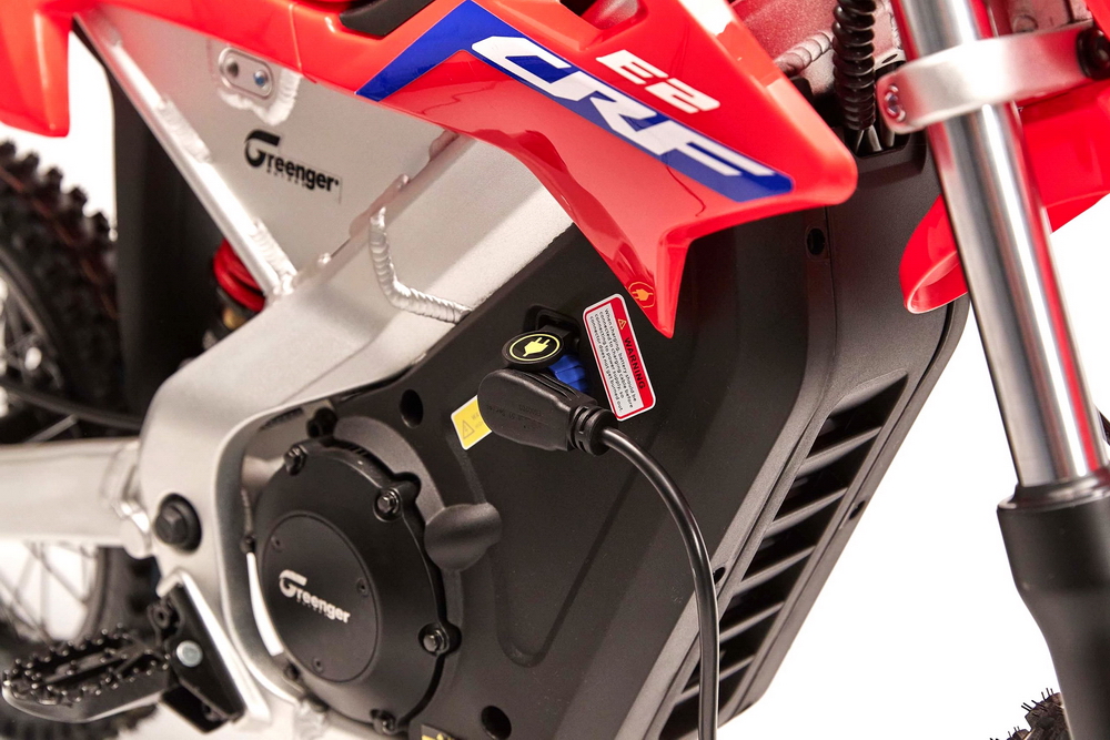 CRF-E2 的動力裝置是一個額定輸出功率 1.2 kw/2000 rpm、峰值輸出功率 2.5 kw 的風(fēng)冷式無刷直流電機(jī),中置式的布局,電壓 48V、最大轉(zhuǎn)速 4000 rpm。鋰離子的電池組、容量為 20 Ah/960 Wh,重量僅為 5.9 公斤,采用了可快速拆卸的設(shè)計。車輛采用兩級輸出可調(diào)的設(shè)計,滿電的情況下,可使用大約兩小時。標(biāo)準(zhǔn)充電模式之下,所需的充電時間(從完全沒有電到 100% 充滿)大約為四小時,使用選配的快速充電器、充電時間則可以降低至只需大約 2.5 小時。