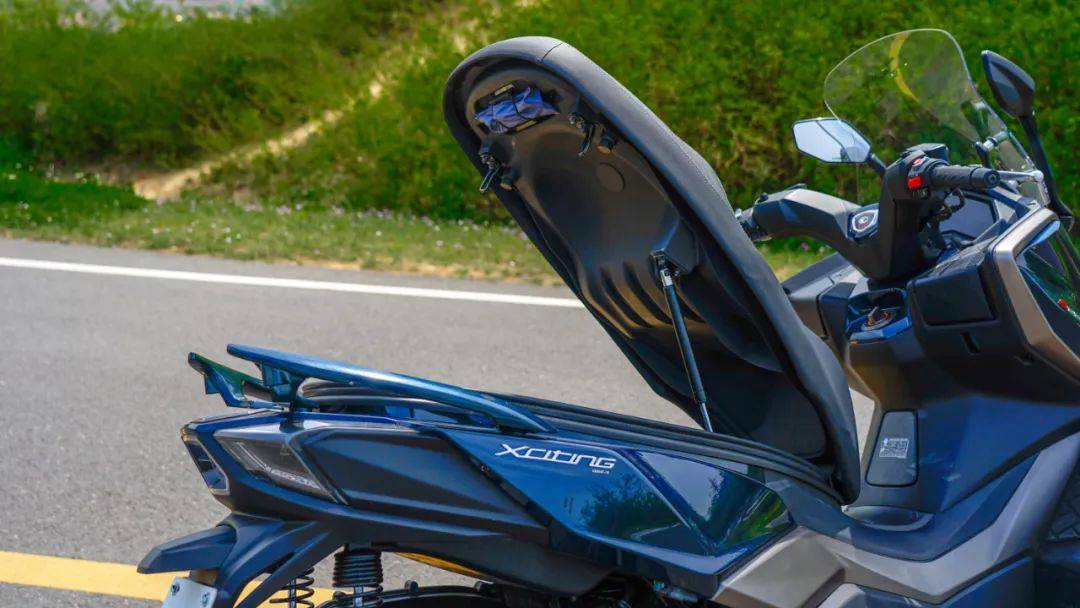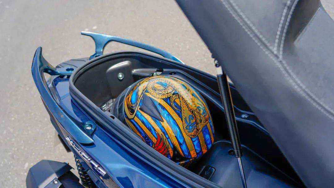 對(duì)于這樣尺寸的大踏板車型,大家也比較關(guān)心它的座桶空間,S250座桶下可以完全容納一頂全盔,但是受限于座桶寬度,放置頭盔需要取下頭盔上的藍(lán)牙耳機(jī)。座桶縱向空間很大,除了放置一頂全盔,前部仍有不小的空間可以放置騎行裝備,除此以外,座桶內(nèi)有LED照明燈,并且還有液壓桿,保持座墊開啟角度。 同 時(shí)S250的座墊采用雙側(cè)鎖扣設(shè)計(jì),座椅蓋上后更加穩(wěn)定,也不容易產(chǎn)生異響。